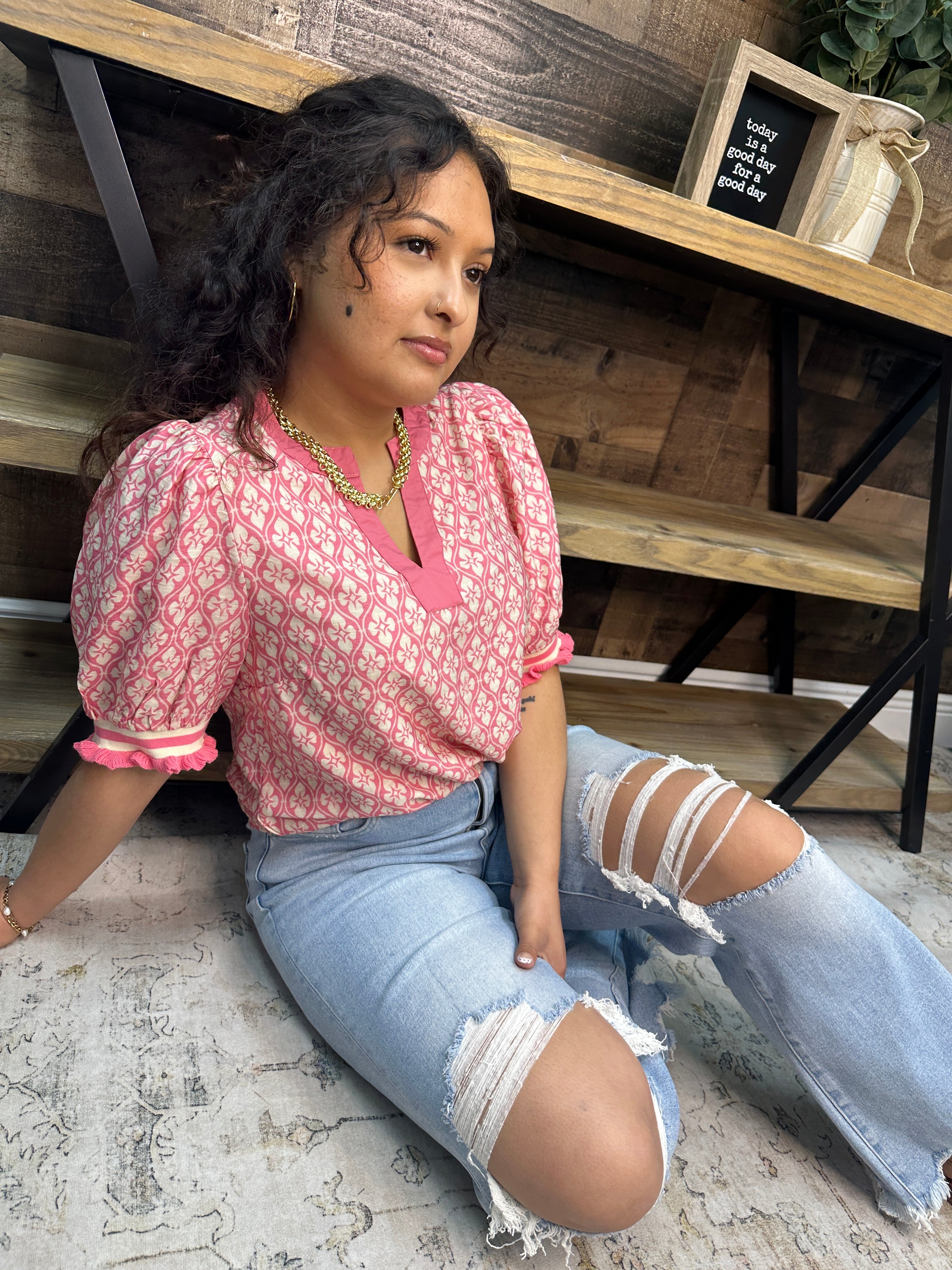 • Brighten your wardrobe with this eye-catching geo floral top! Featuring a striking mandarin color-contrasted collar and playful puff half sleeves with ruffled knit banding at the hem, this piece brings personality to any outfit. The vibrant coral tones pair beautifully with the geometric floral print for a look that's both fun and fashion-forward. Perfect for adding a pop of color to your everyday style.