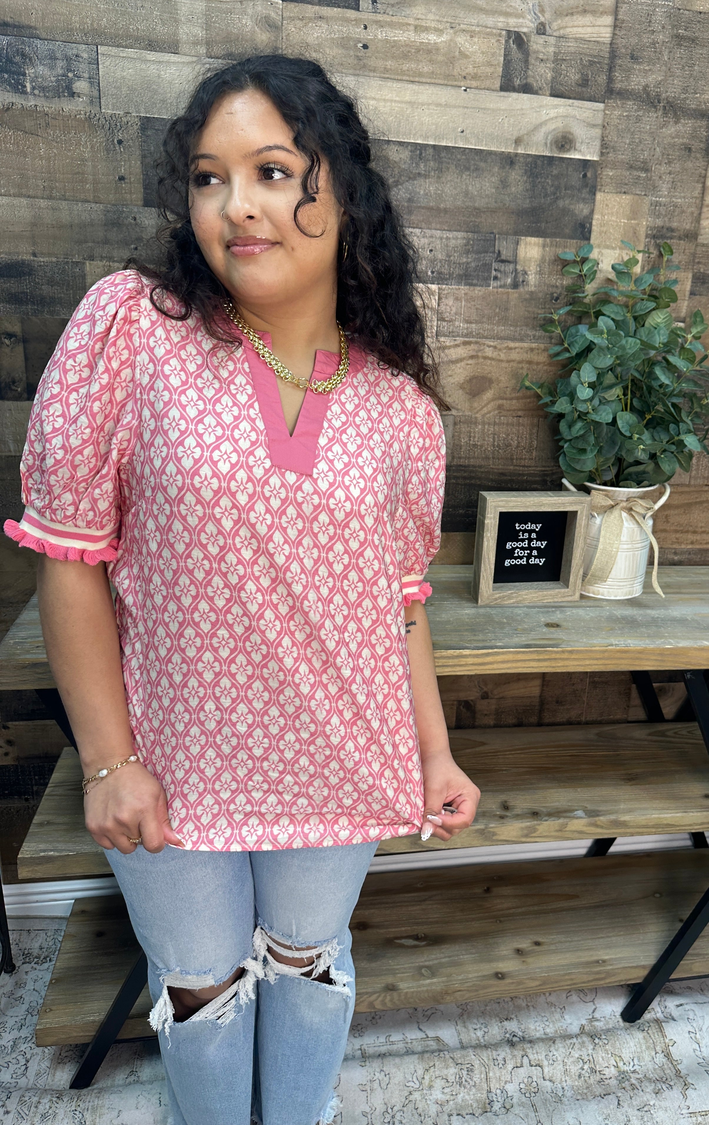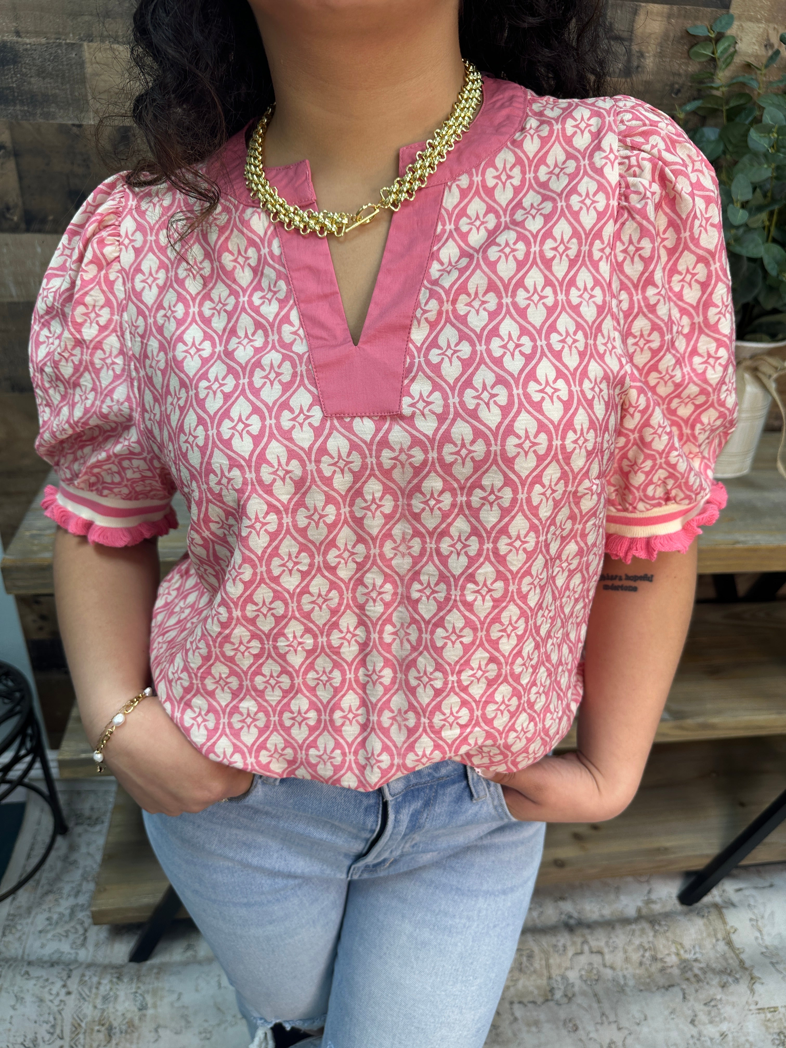 Staccato Pink Coral Geo Floral Short Slv Top