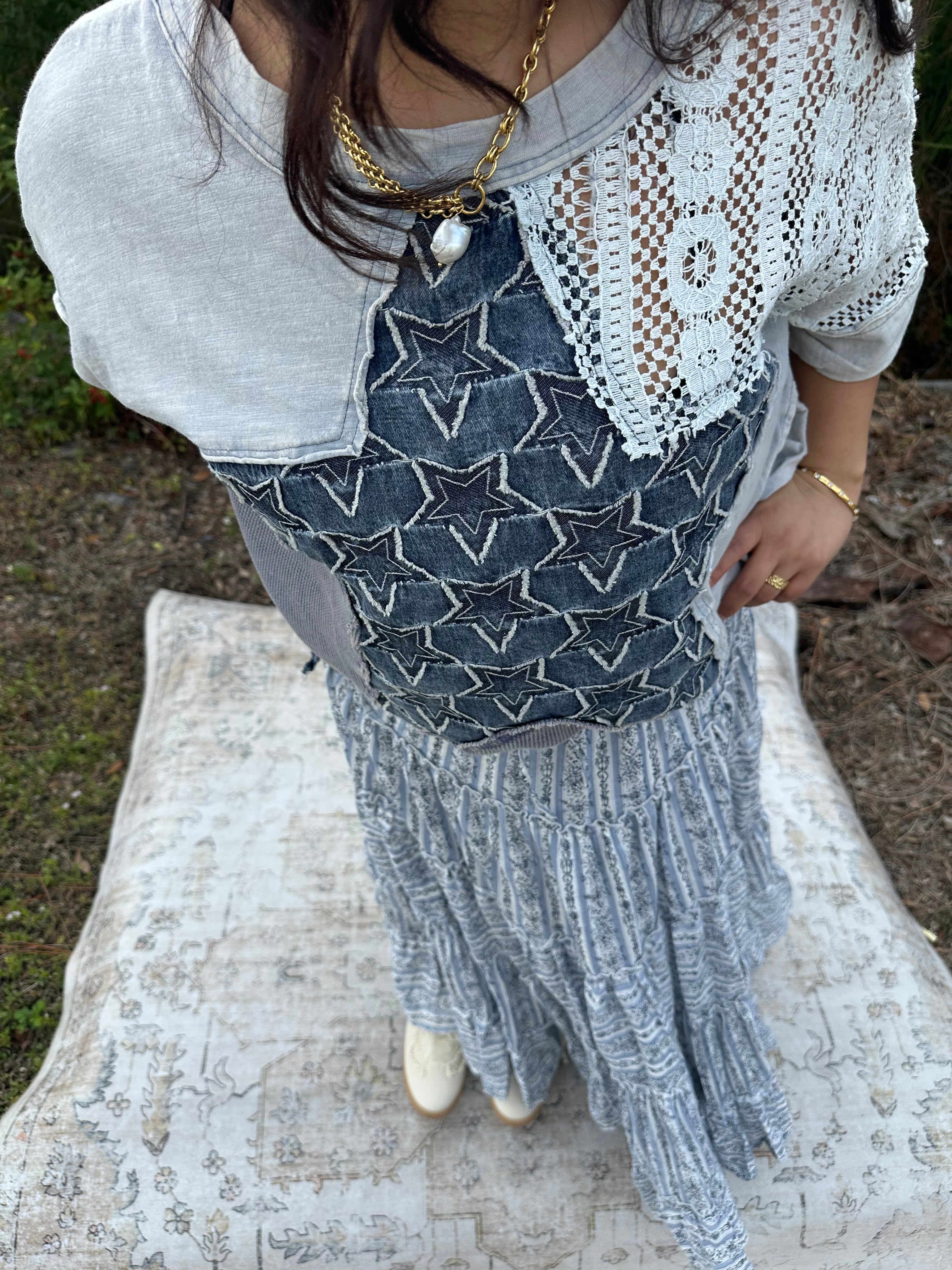 Embrace your inner boho dreamer with this oversized denim patchwork star top! This playful piece features a charming star patchwork design that catches the light beautifully. The relaxed, oversized fit makes it perfect for layering or wearing solo—ideal for casual days when you want comfort without sacrificing style. Mix and match with your favorite basics for an effortlessly cool vibe that's totally you.