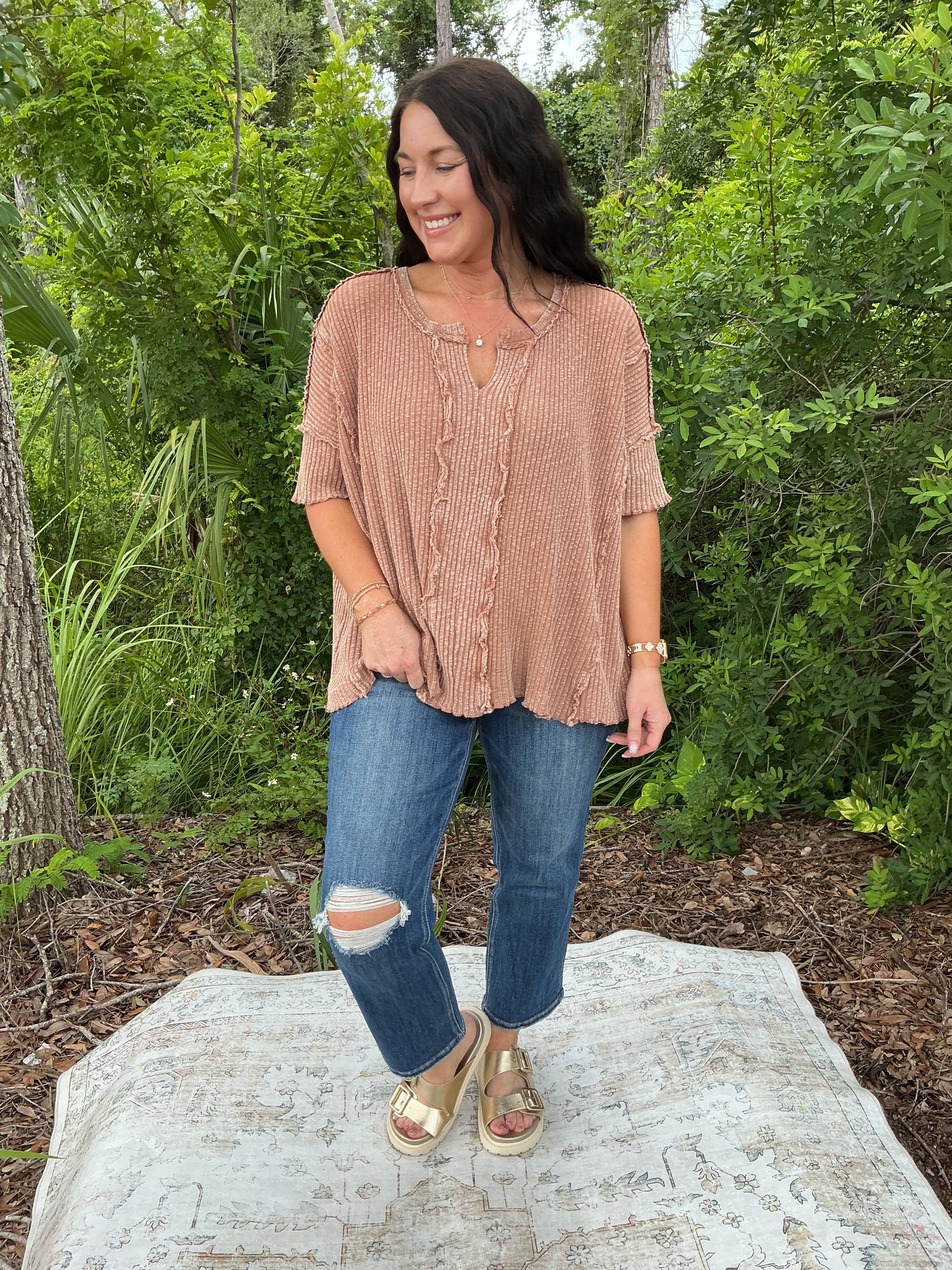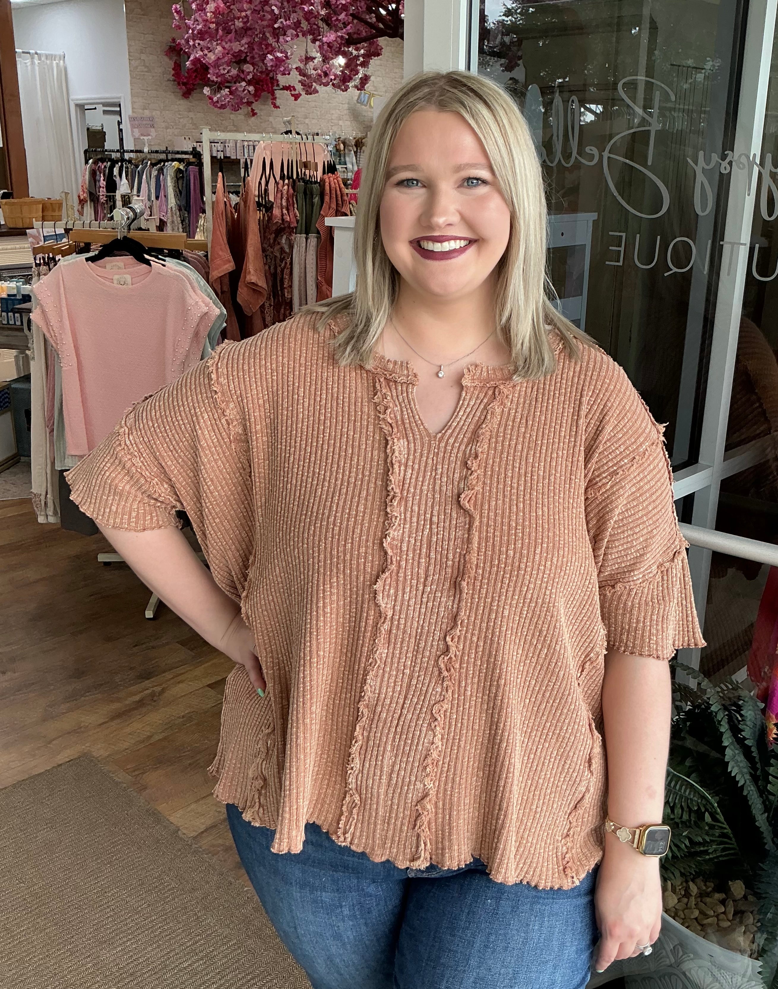 Oversized top in a fabulous ribbed texture fabric by Easel. The Large will easily fit a 2X so size down!