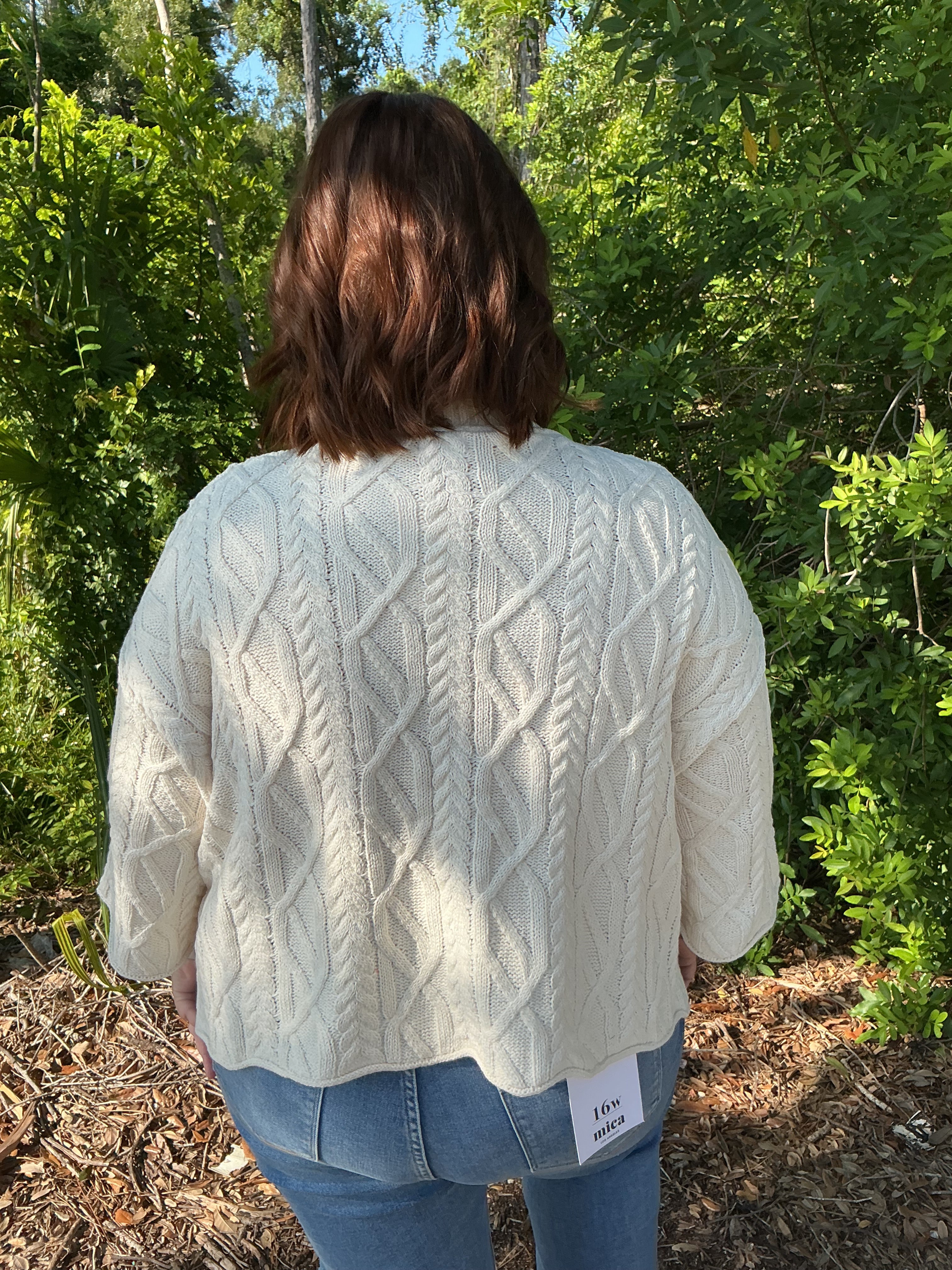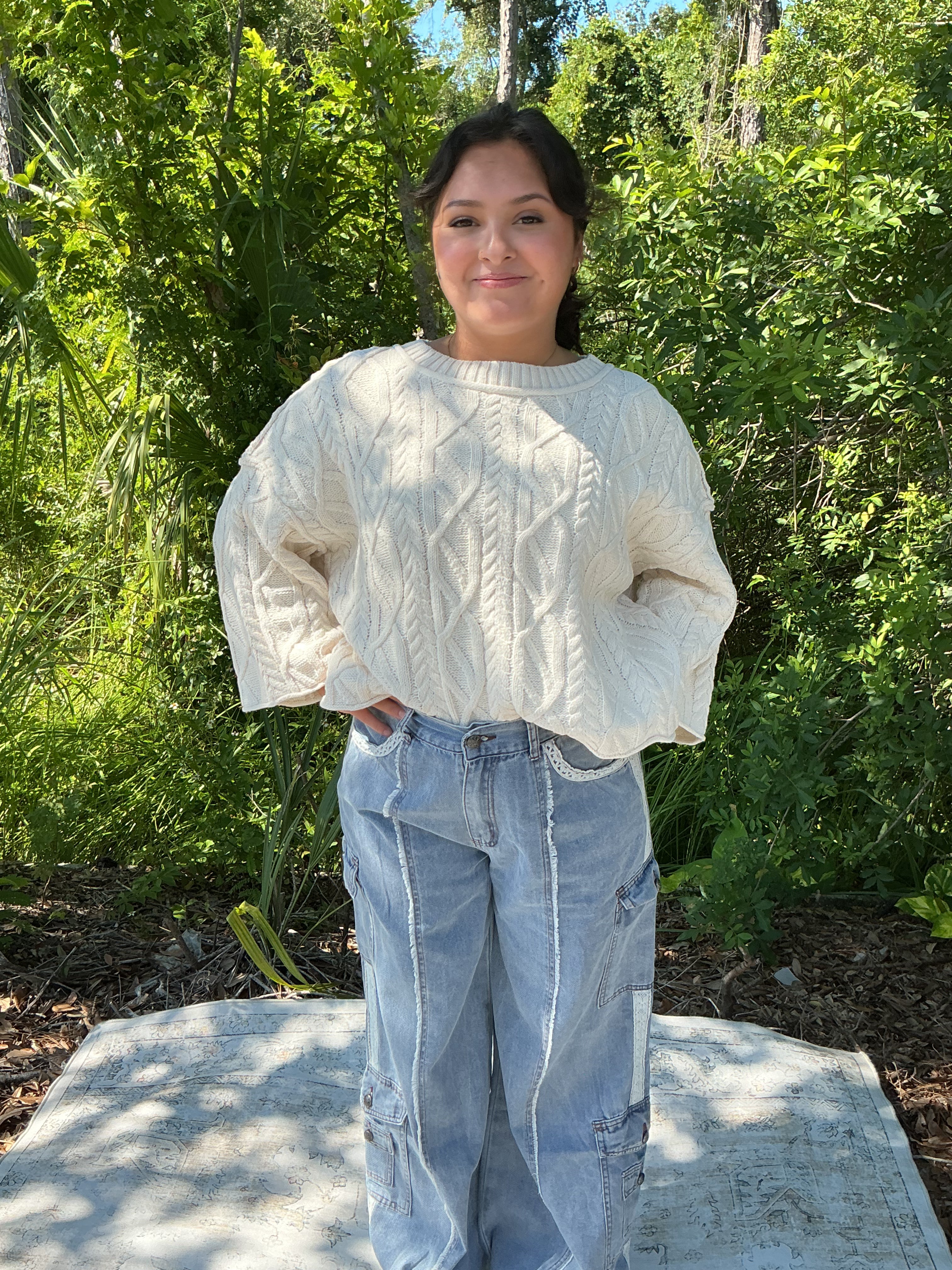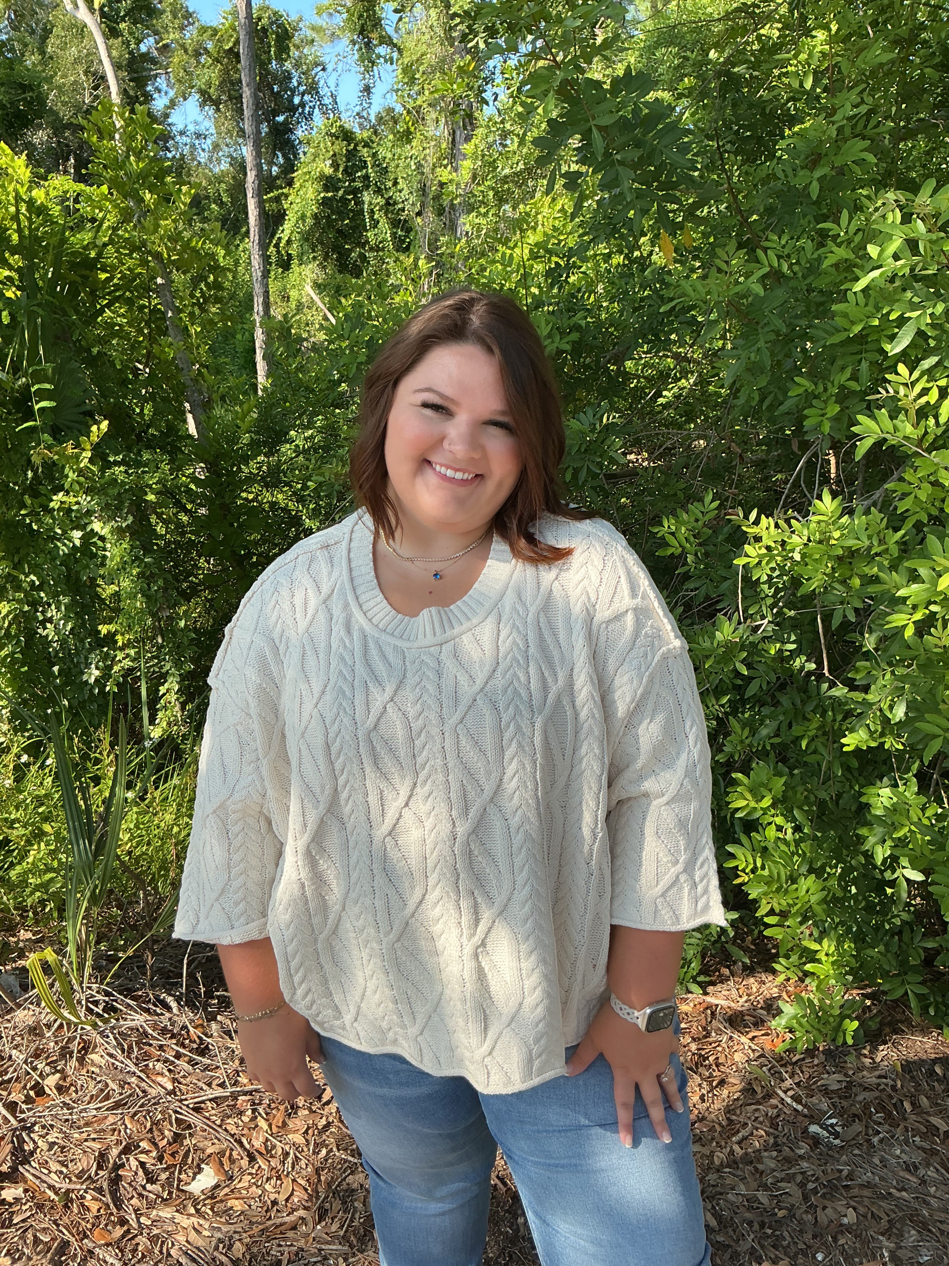 Get cozy and stylish with this oversized cable knit sweater featuring a playful round neck and 3/4 sleeves. Its unique pointed slit detail adds a fun twist to a classic solid pattern. Perfect for layering or rocking solo, available in three vibrant colors to brighten up any outfit!