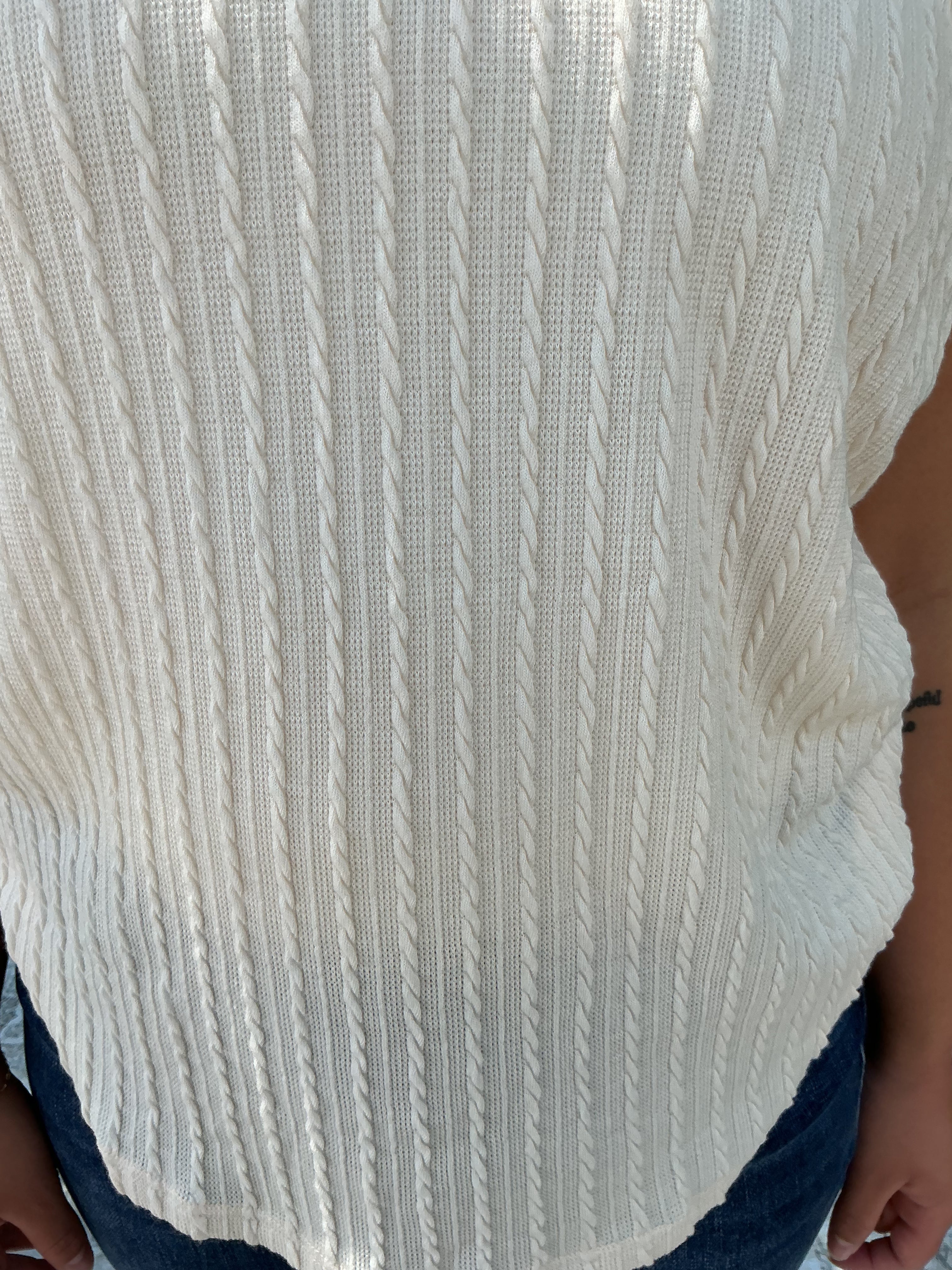This Ivory cap sleeve top is a delightful twist on classic knitwear. Featuring a playful mix of horizontal and vertical cable-inspired patterns, it adds a fun texture that flatters every angle. The V-neckline and soft stretch fabric keep things comfy and breezy, while the relaxed fit makes it your go-to for effortless style. Whether paired with jeans for a casual day or tucked into a skirt for a chic touch, this top brings a little joy to your everyday look.
