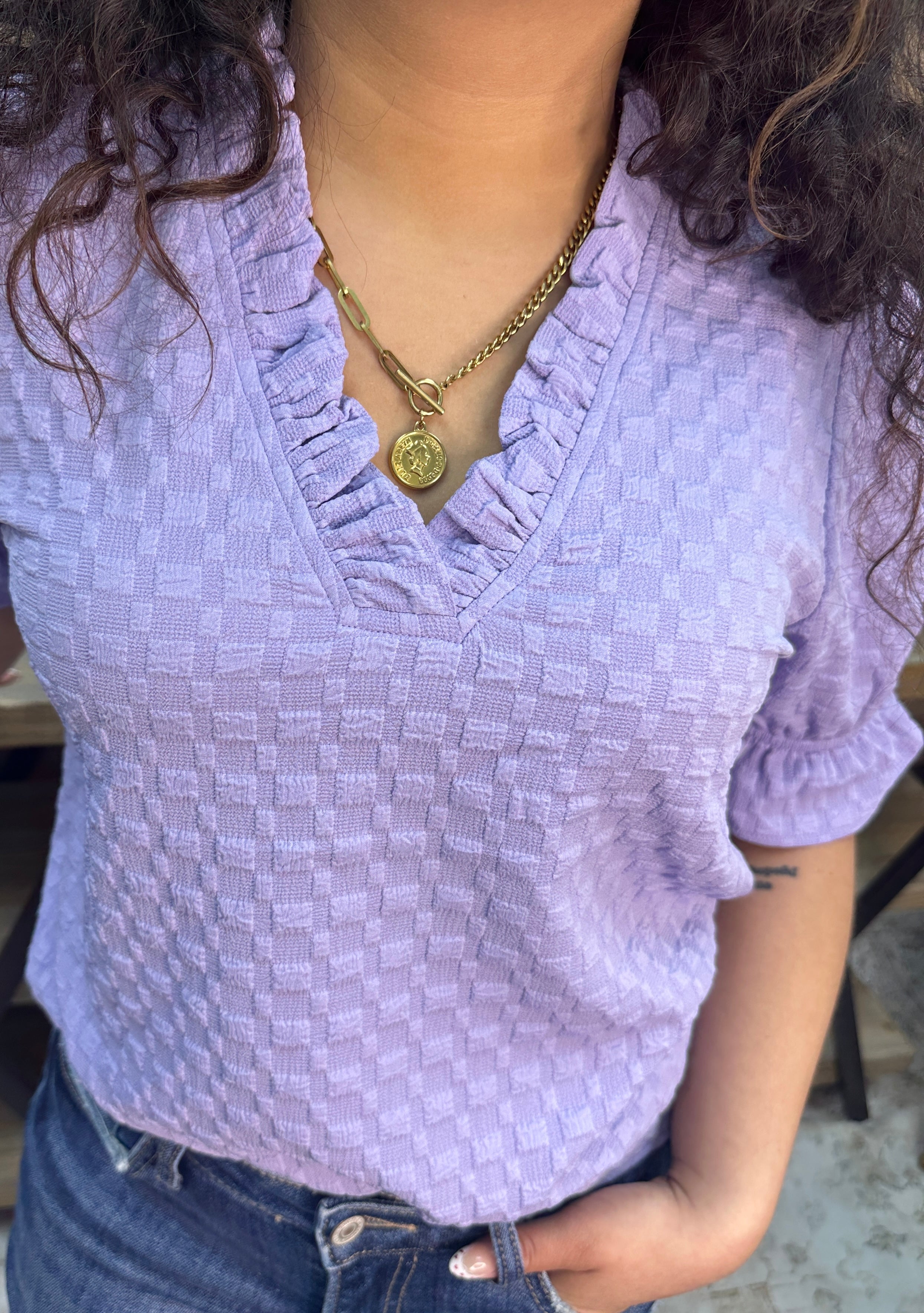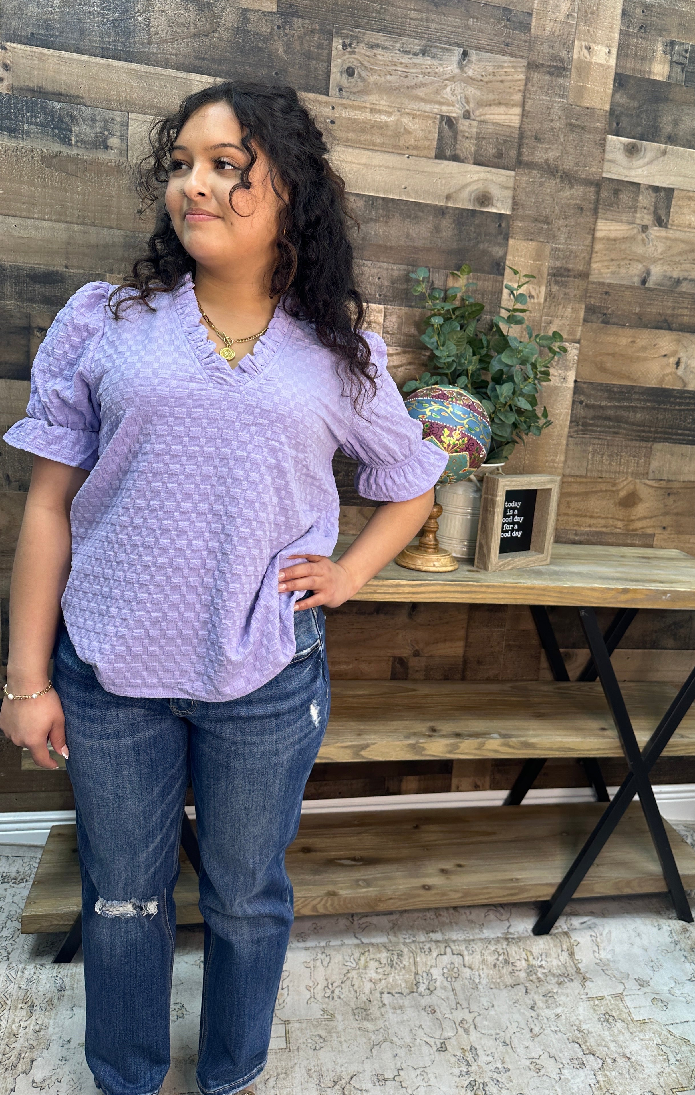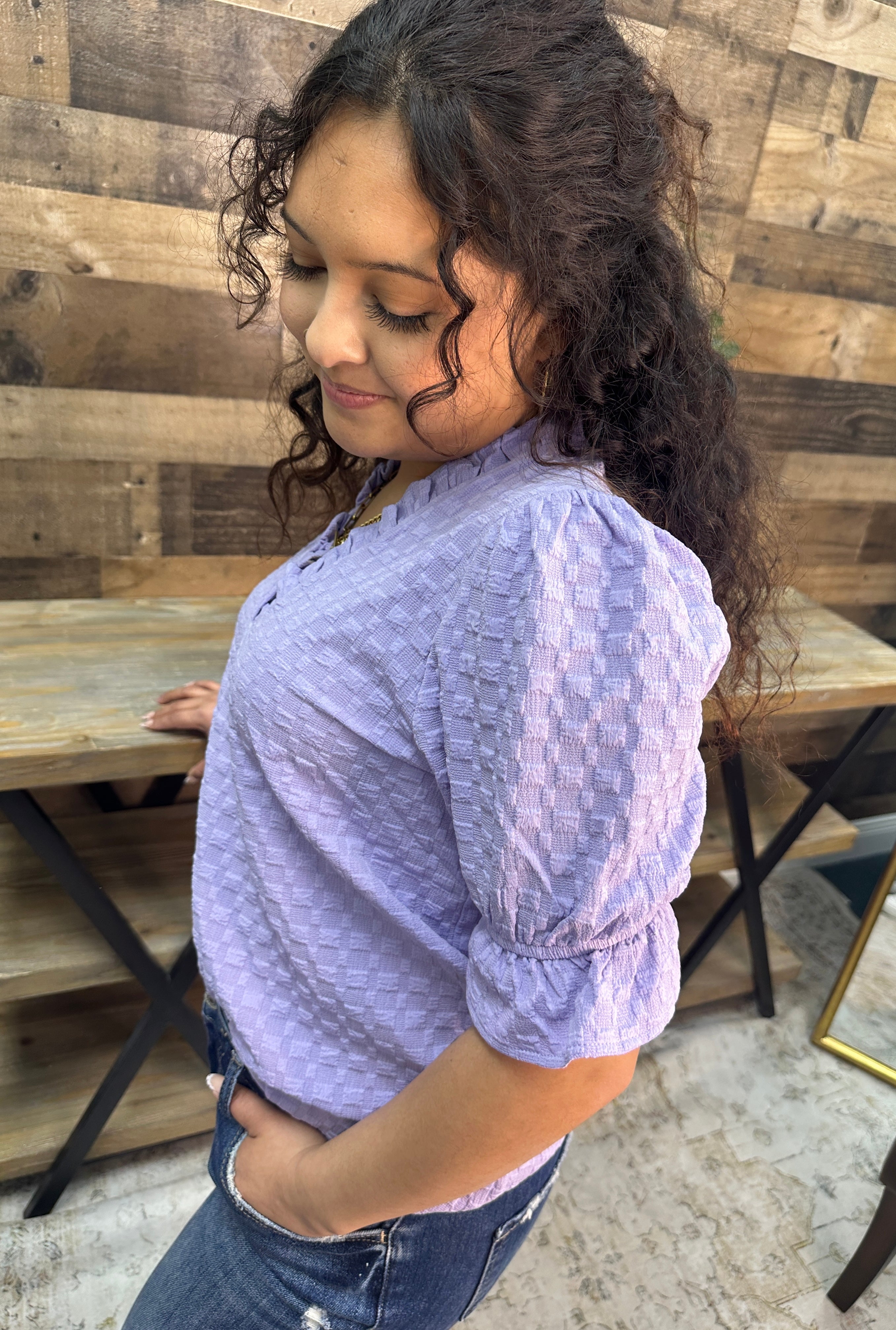 Lavender dreams meet textured charm in this playful ruffle-trimmed top. The flattering V-neckline and short sleeves offer effortless style, while the dimensional fabric adds visual interest and movement. Perfect for layering or wearing solo, this piece brings a touch of whimsy to any wardrobe. Dress it up or down—versatility never looked so good.