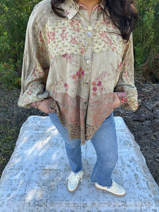 Boho Western Gravel Bishop Sleeve Top w/ Embroidery Accents