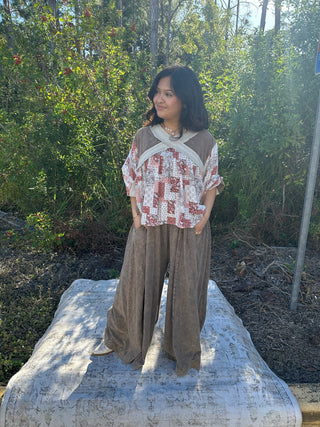 Entro Brown Floral Flutter Sleeve Top w/ Contrasting Band & Lace Trim
