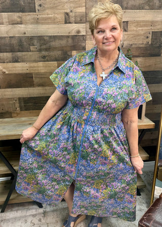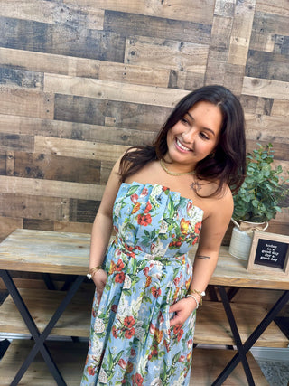 Entro Blue Floral Taupe Accent Belted Dress FINAL SALE