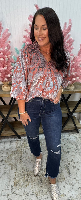 Pink & Navy Paisley Puff Slv Top Umgee