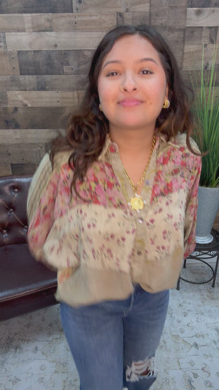 Young Threads Khaki & Pink Floral Embroidered Patchwork Top