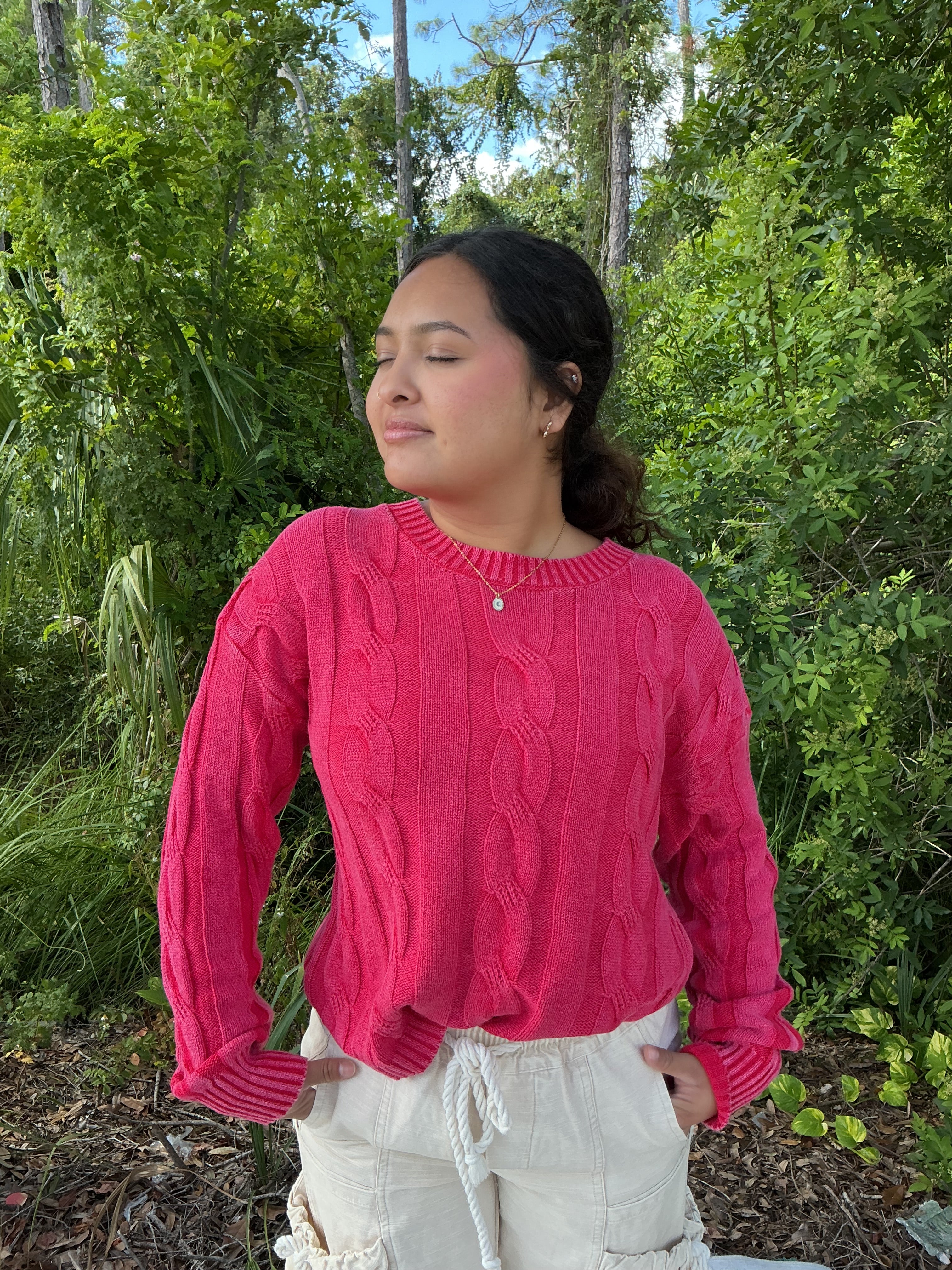 Brighten your look with the Adora Mineral Wash Cable Knit Sweater! Featuring a classic cable knit design in a washed plum or washed red, this sweater adds a playful twist to your cozy essentials. Perfect for layering, it’s soft, breathable, and ready to keep you warm with style and a little extra flair.