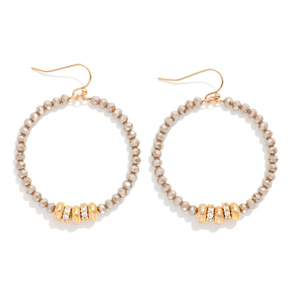 Dusty Turquoise Bead Hoop Drop Earrings Featuring Metal Tone Disc Charms With Rhinestones