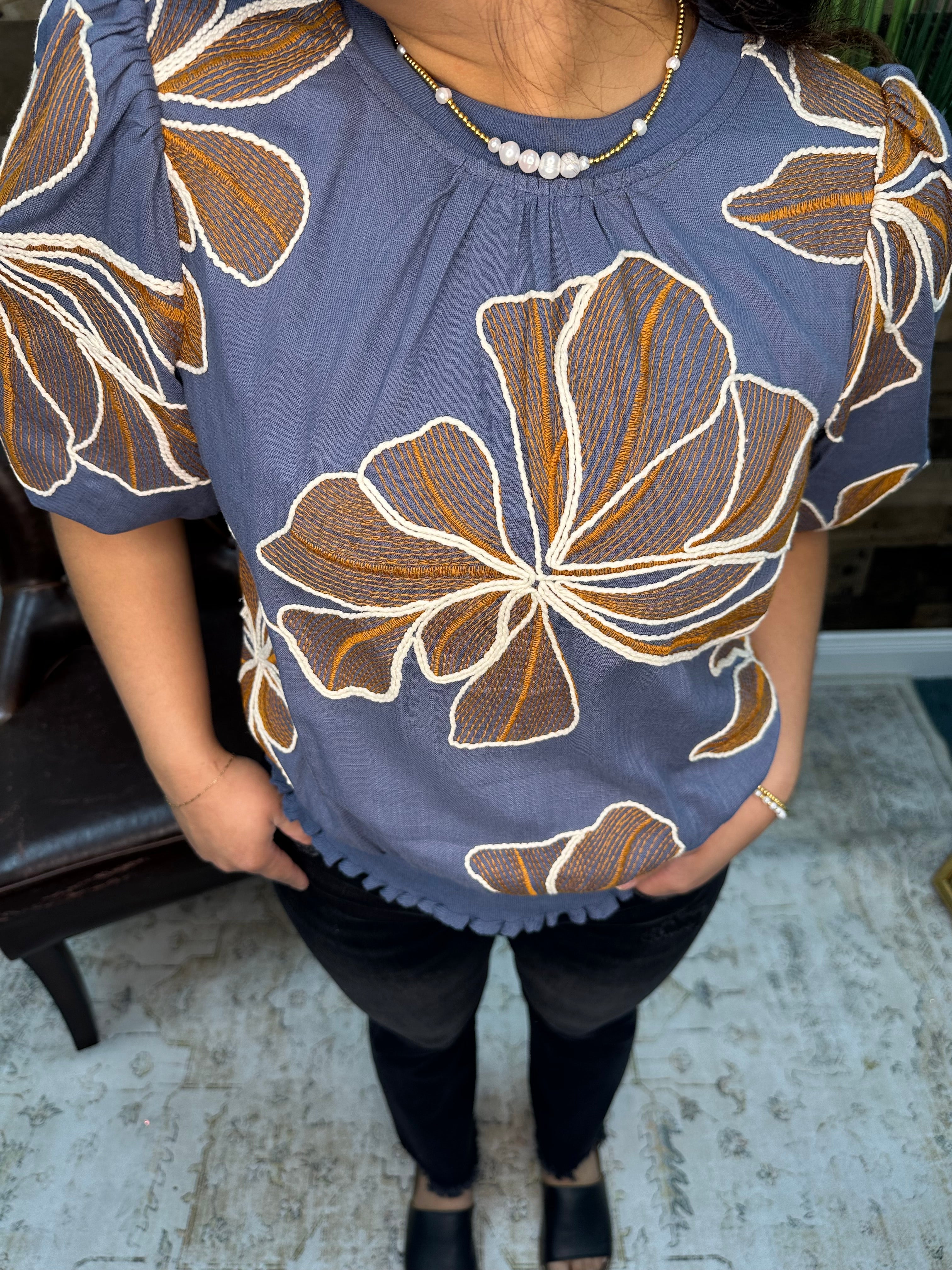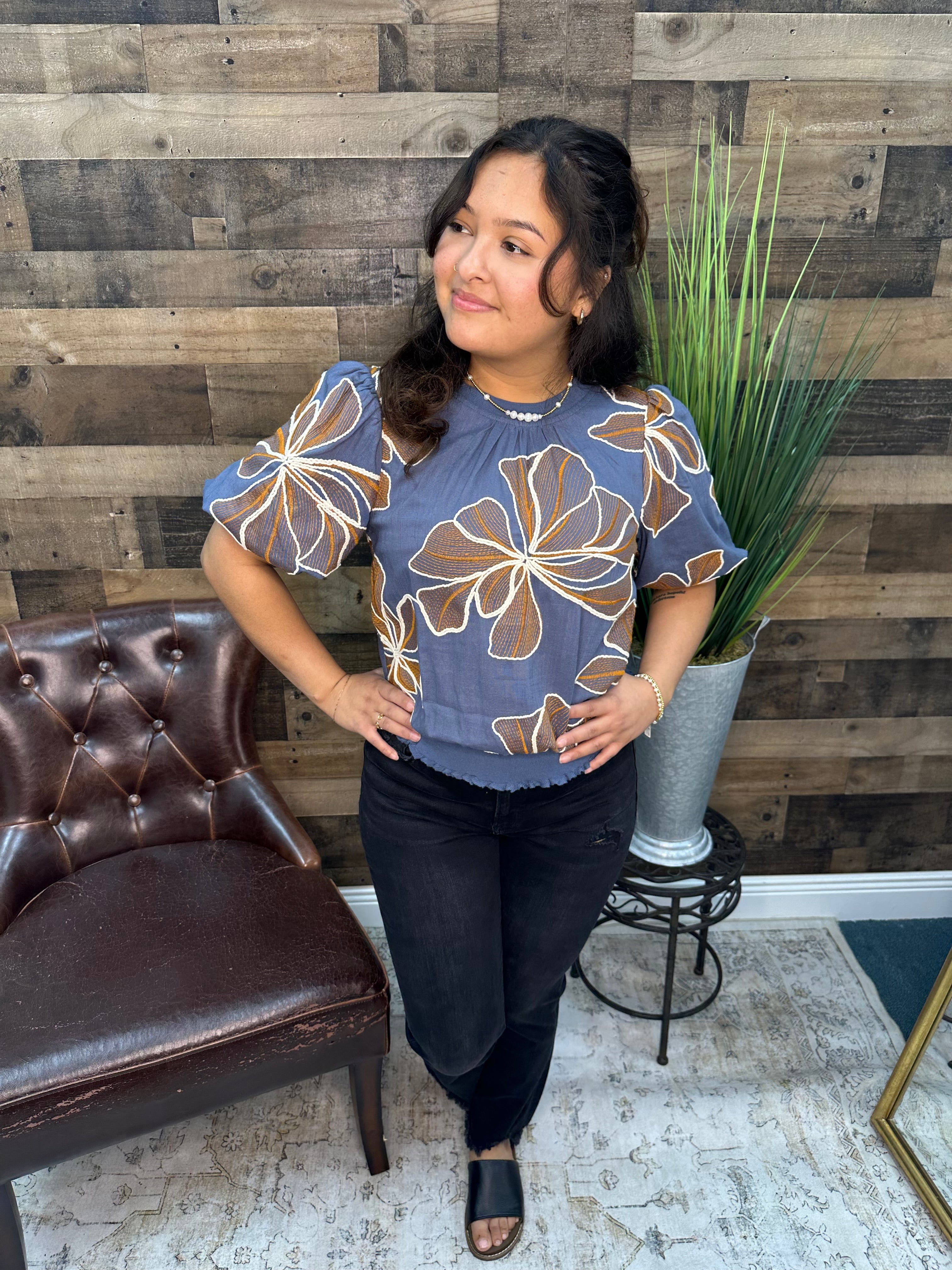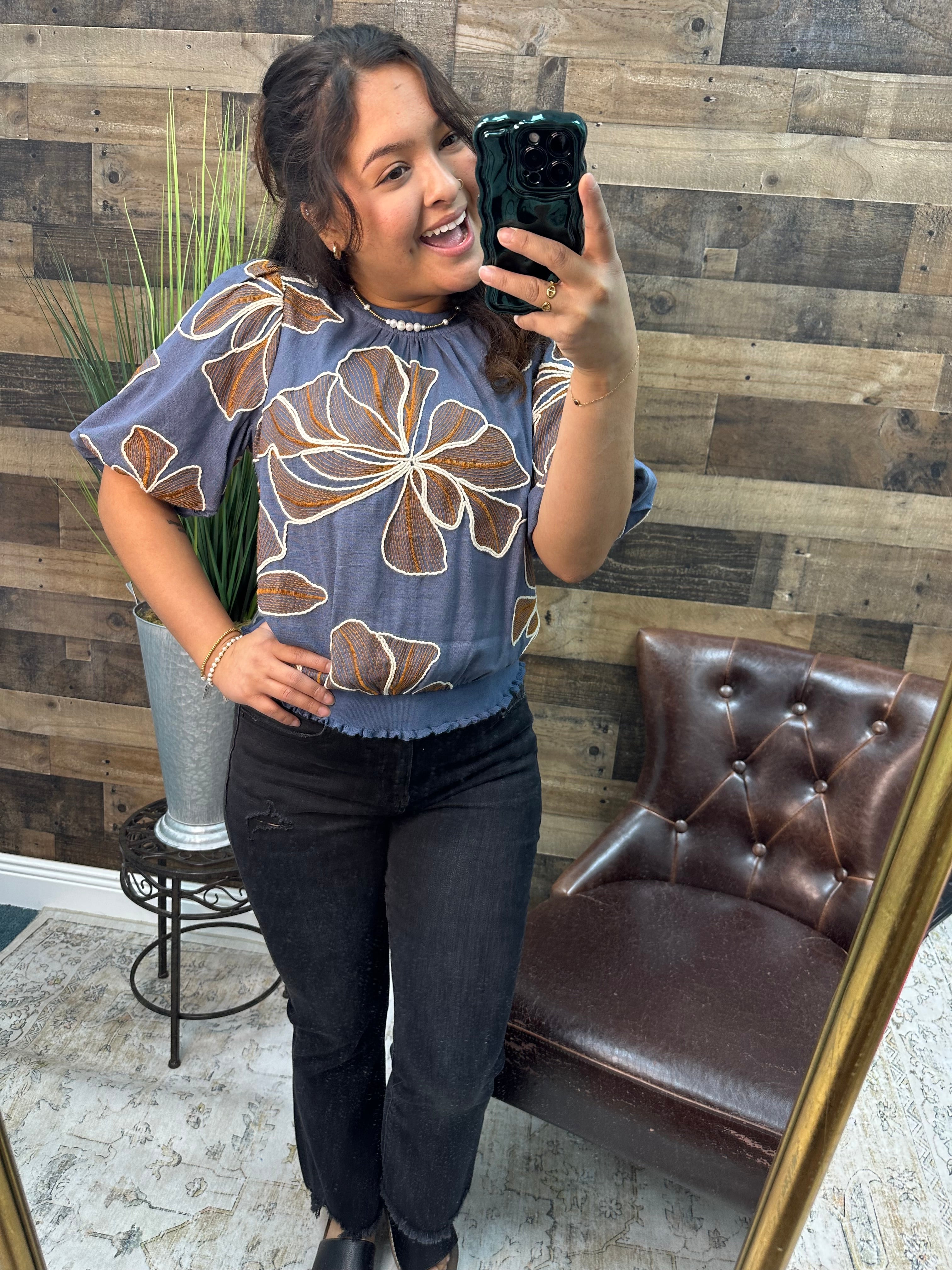 This charming blue top by VOY features delicate floral embroidery that adds a whimsical touch to your look. The playful lettuce edge hem gives it a flirty finish, perfect for pairing with your favorite jeans or skirts. Light and breezy, it’s designed to keep you comfortable while turning heads wherever you go. Add a splash of fun to your wardrobe with this beautifully detailed piece!
