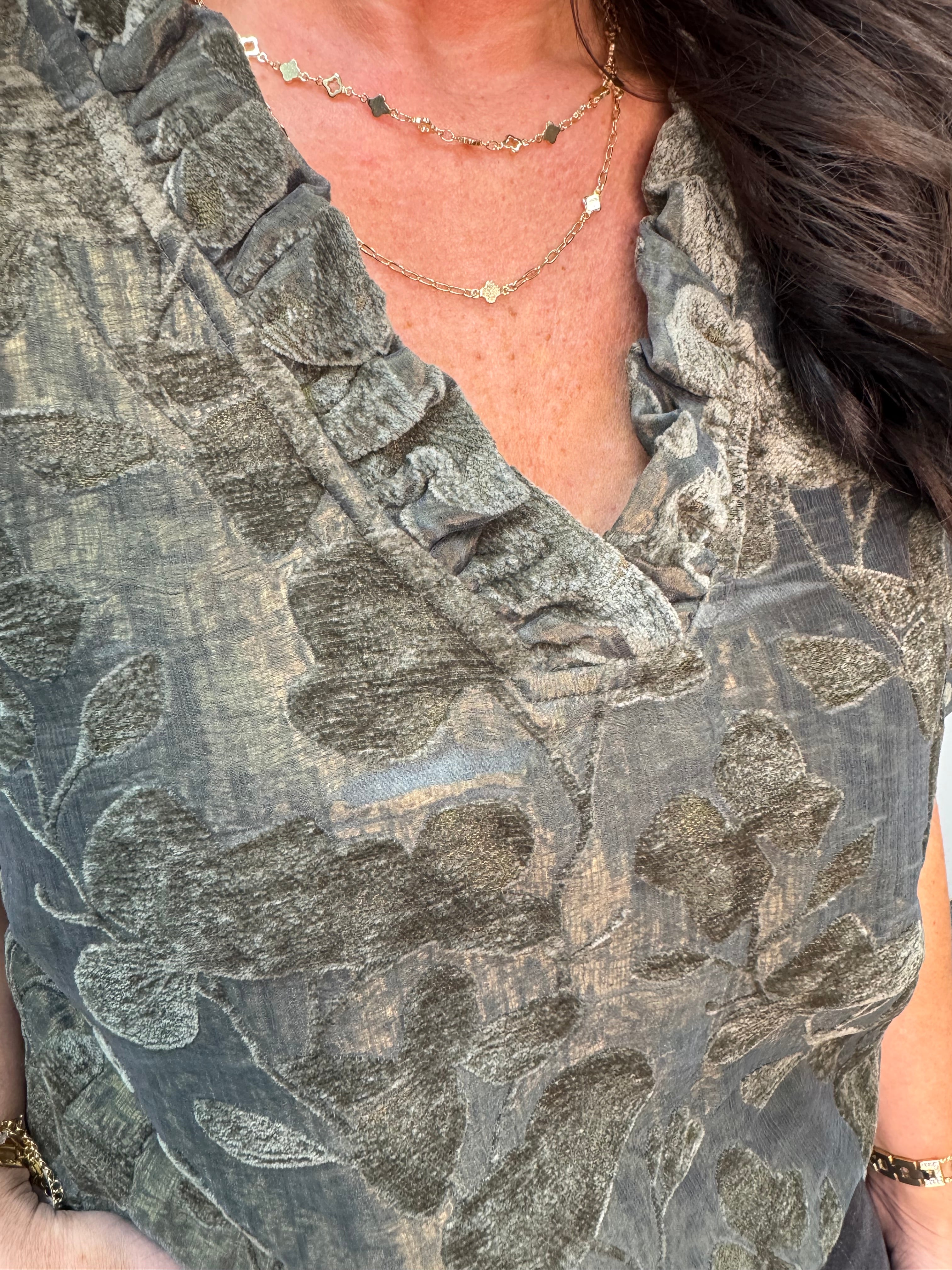 Add a dash of holiday charm with the Charcoal Ruffled VNeck Floral Burn Out Top by VOY. This playful piece features delicate floral burn-out details and flirty ruffles that bring a feminine touch to your festive wardrobe. The soft charcoal hue pairs effortlessly with your favorite jeans or skirts, making it a go-to for cheerful gatherings and cozy celebrations. Celebrate the season with style and ease in this light, breezy top designed to brighten any holiday moment.