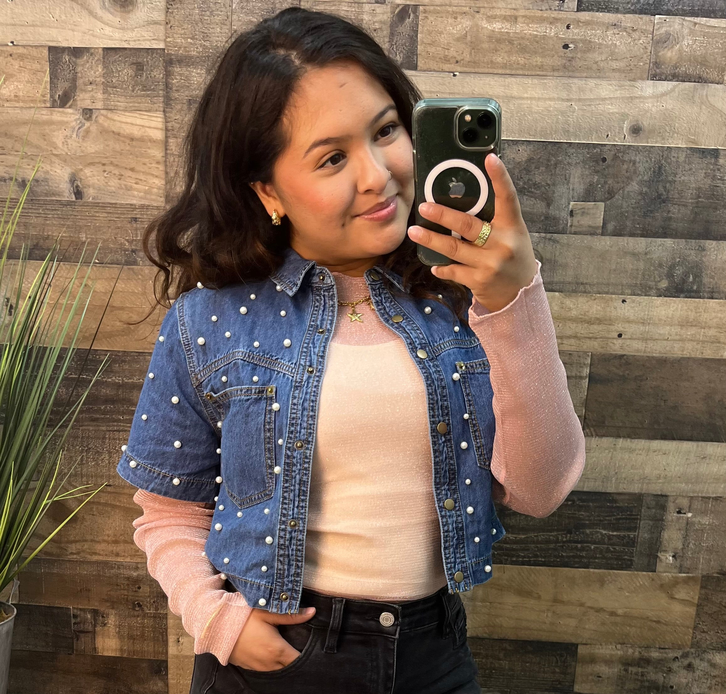 Add a touch of shimmer to your wardrobe with the Davi & Dani Blush Pink Sparkle Mesh Layering Top. Its delicate blush pink mesh sparkles subtly, perfect for layering over your favorite tanks or under your favorite tops. Lightweight and sheer, it brings playful elegance to any outfit, whether you're dressing up or keeping it casual. Embrace effortless sparkle and a hint of flirtiness with this versatile top.