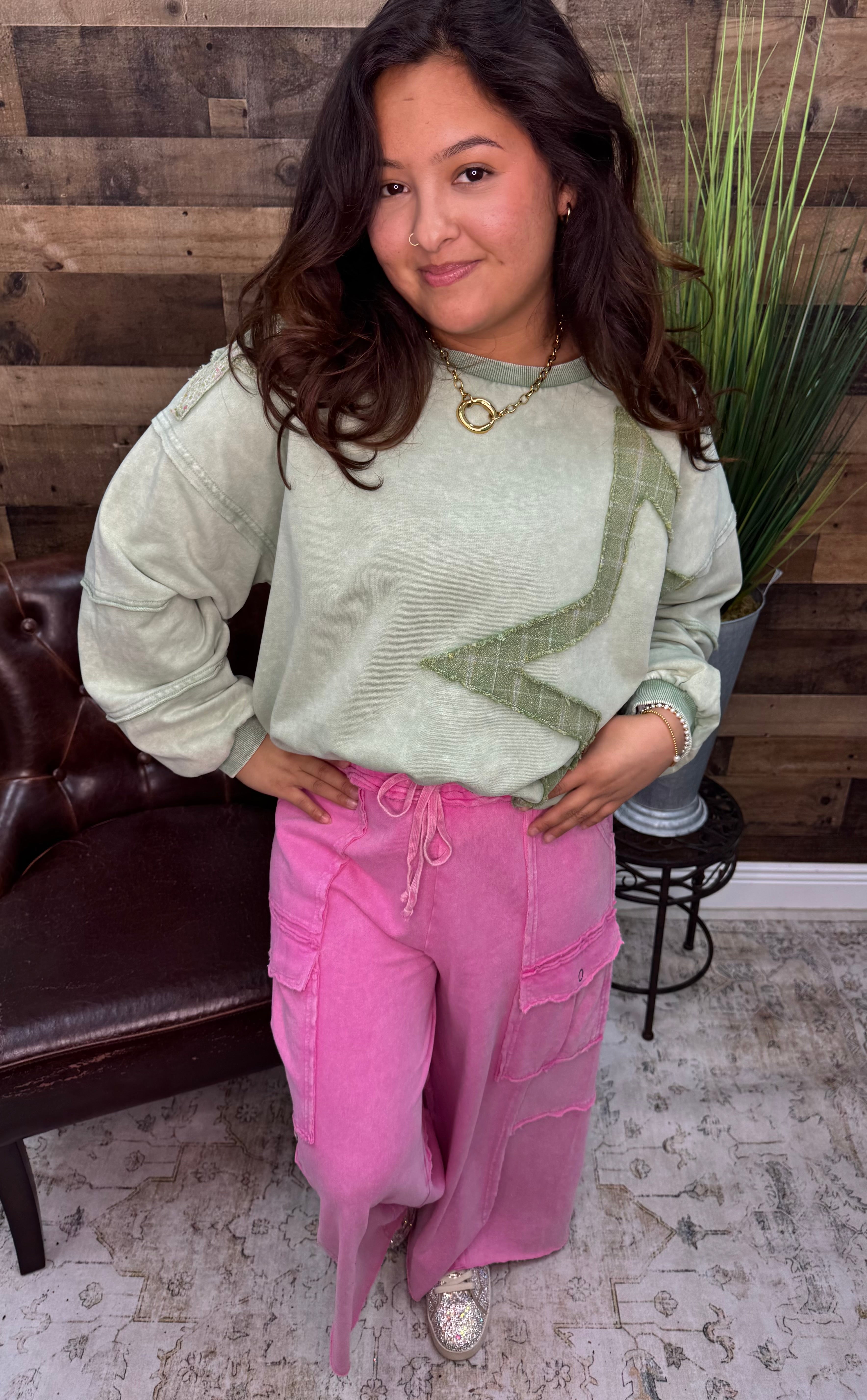 Embrace your celestial side with this whimsical oversize top featuring a charming green floral star applique. Perfect for those who love making a statement, this piece combines comfort with eye-catching style. The relaxed fit offers effortless wearability, whether you're running errands or meeting friends for coffee. The delicate floral detailing adds a touch of romance to your everyday wardrobe. Layer it, tuck it, or wear it loose—this versatile top adapts to your mood and mood alone. A playful essential for anyone who believes fashion should be fun.