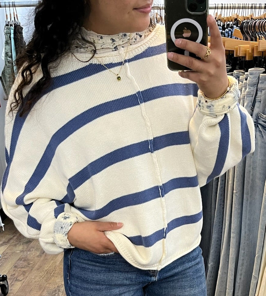 Effortless style meets cozy comfort in this dreamy cream and blue striped dolman sweater top. The relaxed dolman sleeves create a flattering, flowing silhouette perfect for layering or wearing solo. Crafted from soft slub fabric with a subtle texture, this piece brings an easy-breezy vibe to your everyday wardrobe. Whether you're heading to brunch or settling in for a casual day, this striped beauty is your new go-to for laid-back elegance.