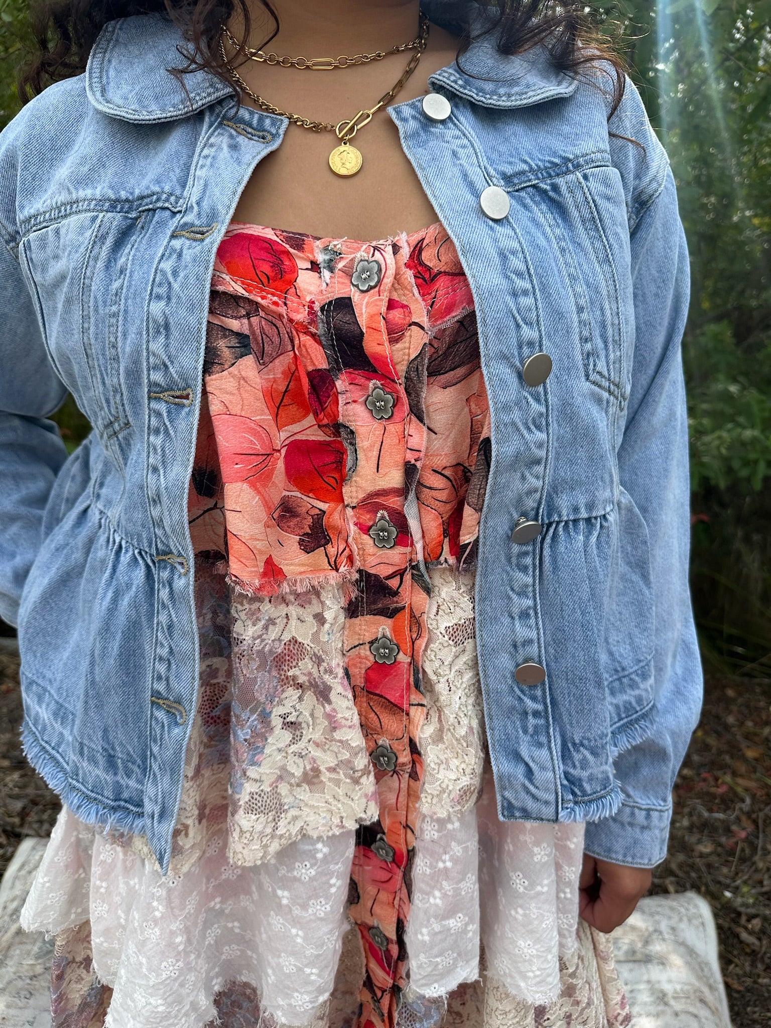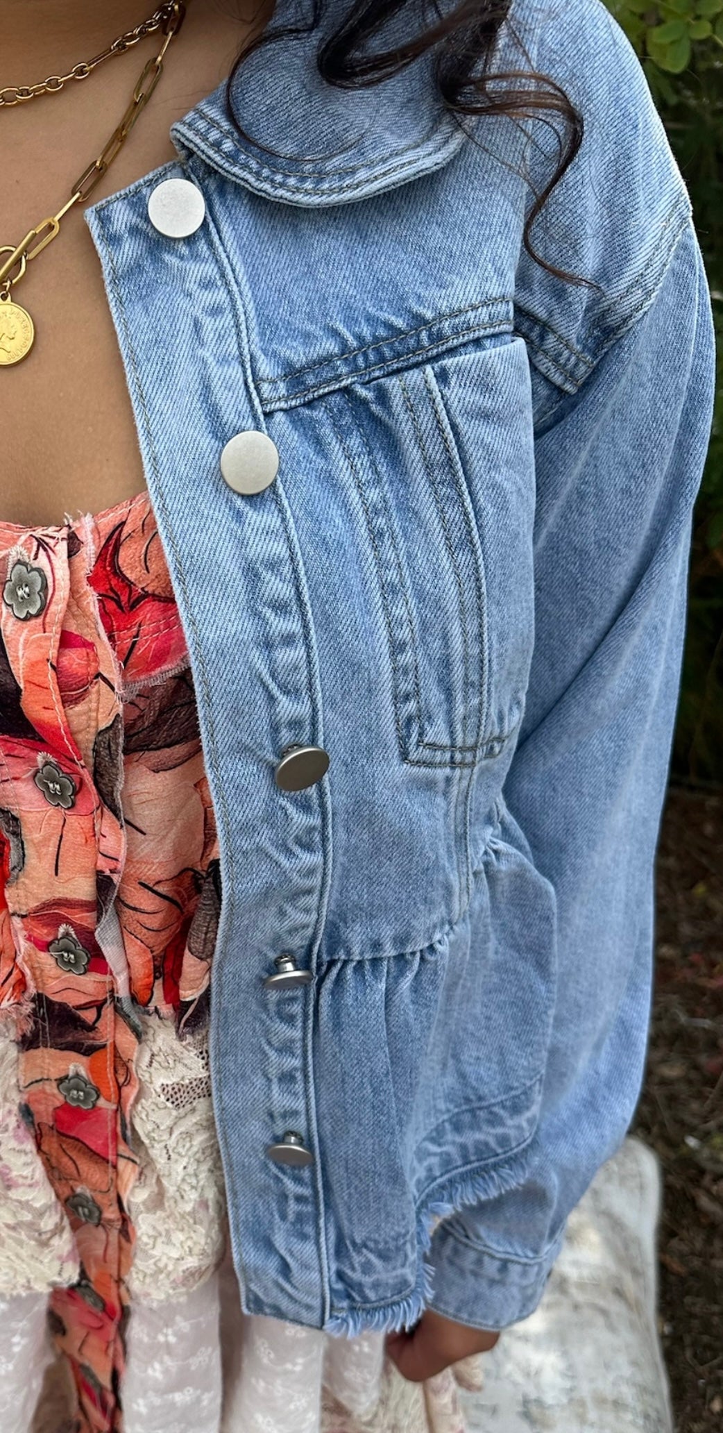 Throw on this soft denim jacket and let those ruffled hems do the talking. The statement round collar adds instant edge while the soft denim keeps things comfortable enough for all-day wear. Whether you're layering over a dress or pairing with your favorite jeans, this jacket brings that effortless cool-girl vibe that makes every outfit feel intentional. Perfect for anyone who refuses to blend in. TRUE TO SIZE!