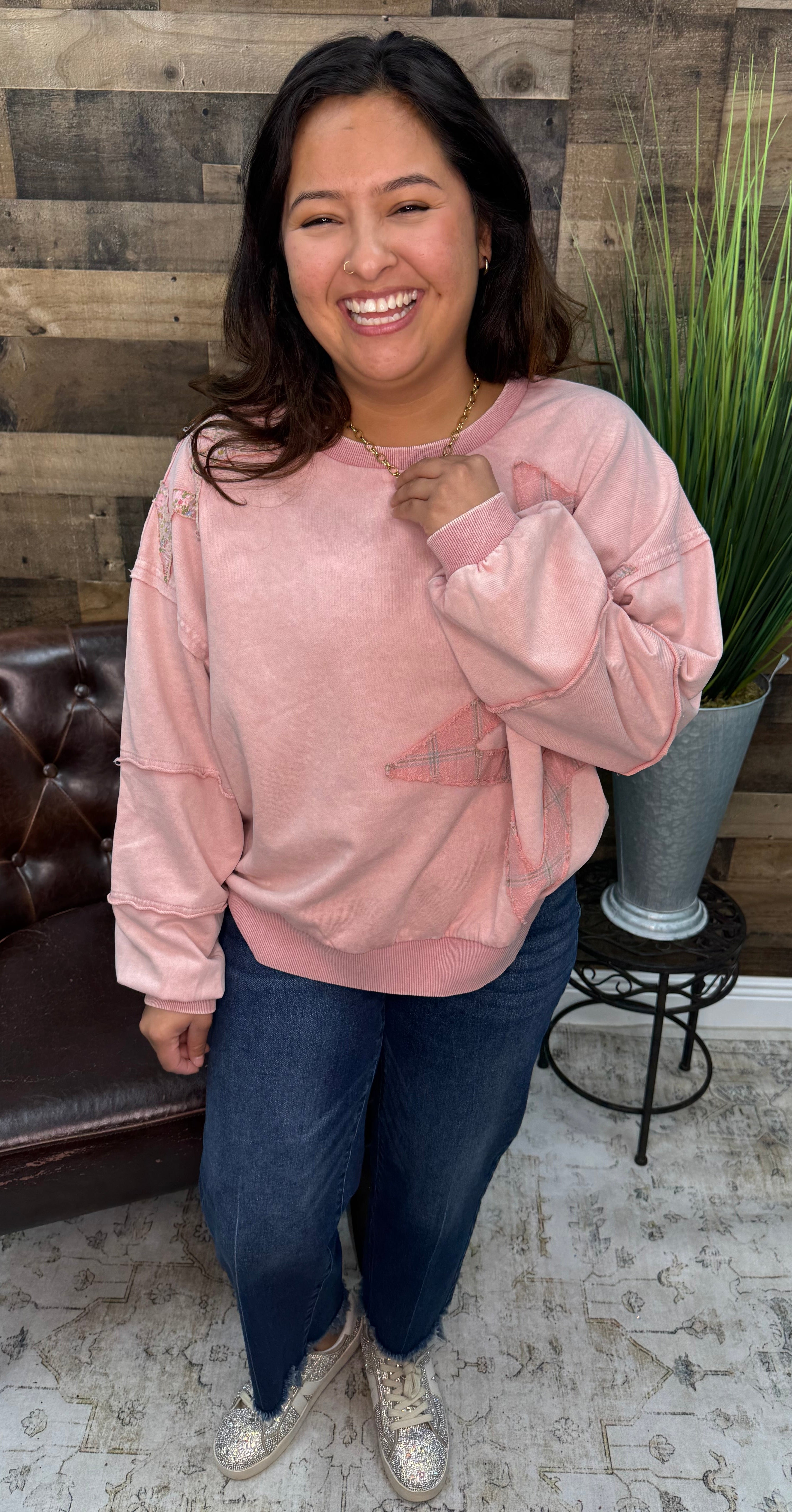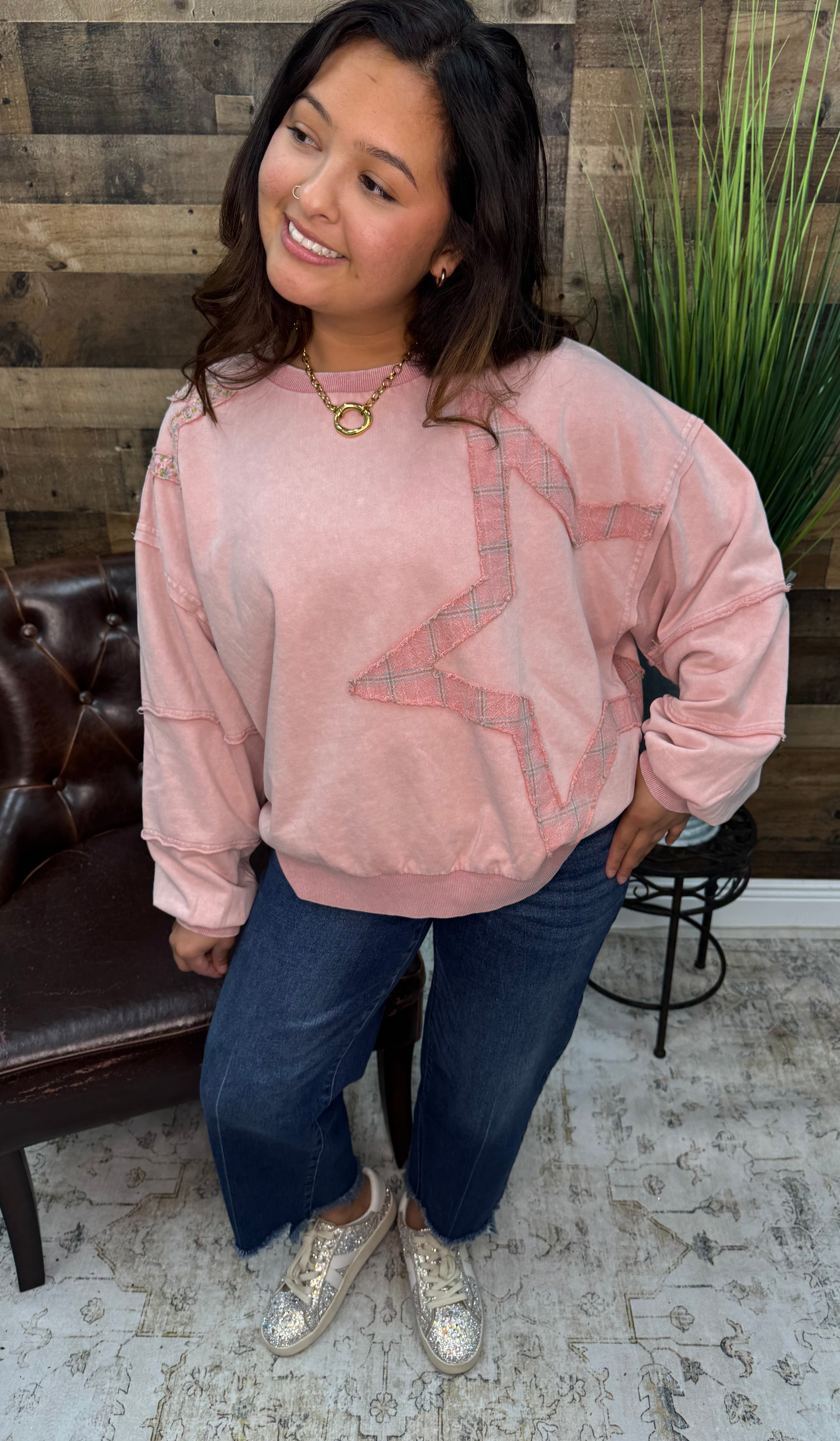 Embrace your celestial side with this whimsical oversize top featuring a charming pink floral star applique. Perfect for those who love making a statement, this piece combines comfort with eye-catching style. The relaxed fit offers effortless wearability, whether you're running errands or meeting friends for coffee. The delicate floral detailing adds a touch of romance to your everyday wardrobe. Layer it, tuck it, or wear it loose—this versatile top adapts to your mood and mood alone. A playful essential for anyone who believes fashion should be fun.