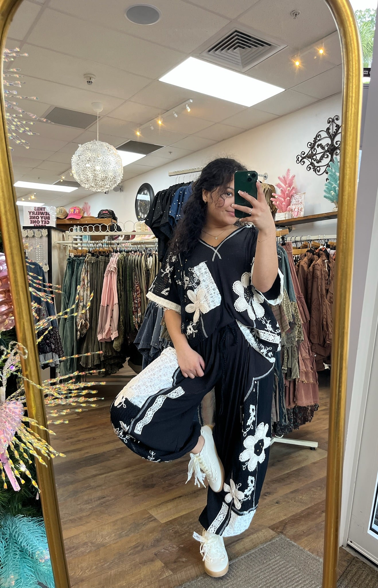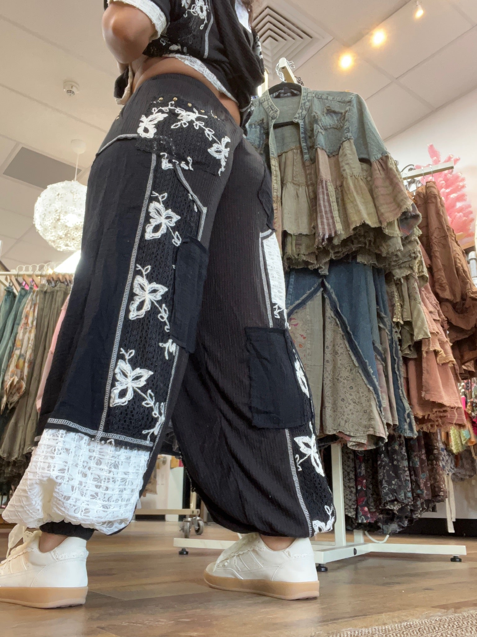 Add a playful touch to your wardrobe with these black & ivory floral crochet joggers from POL. Made with intricate crochet detailing, these joggers effortlessly combine comfort and style. Perfect for a casual day out or lounging at home.