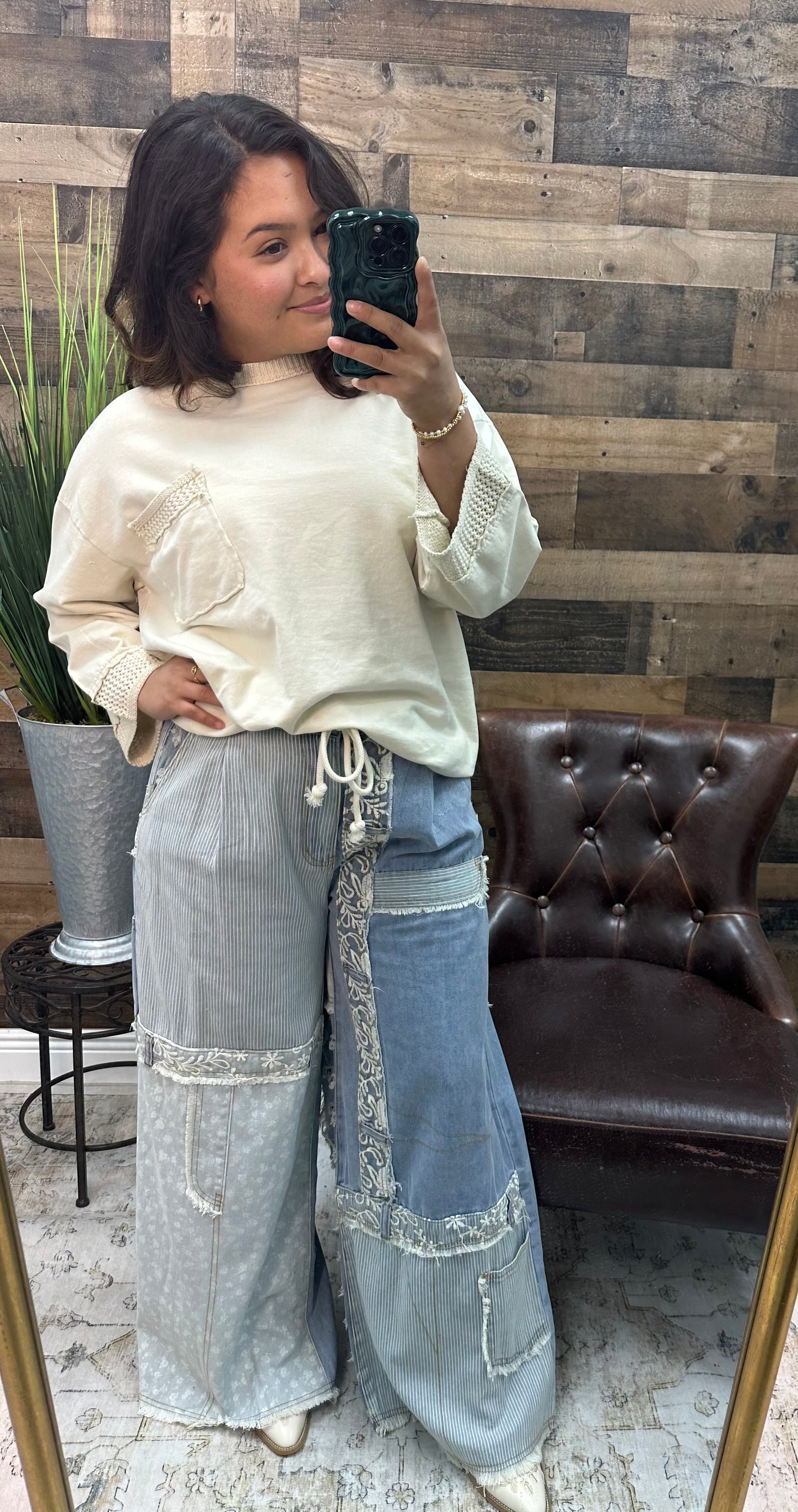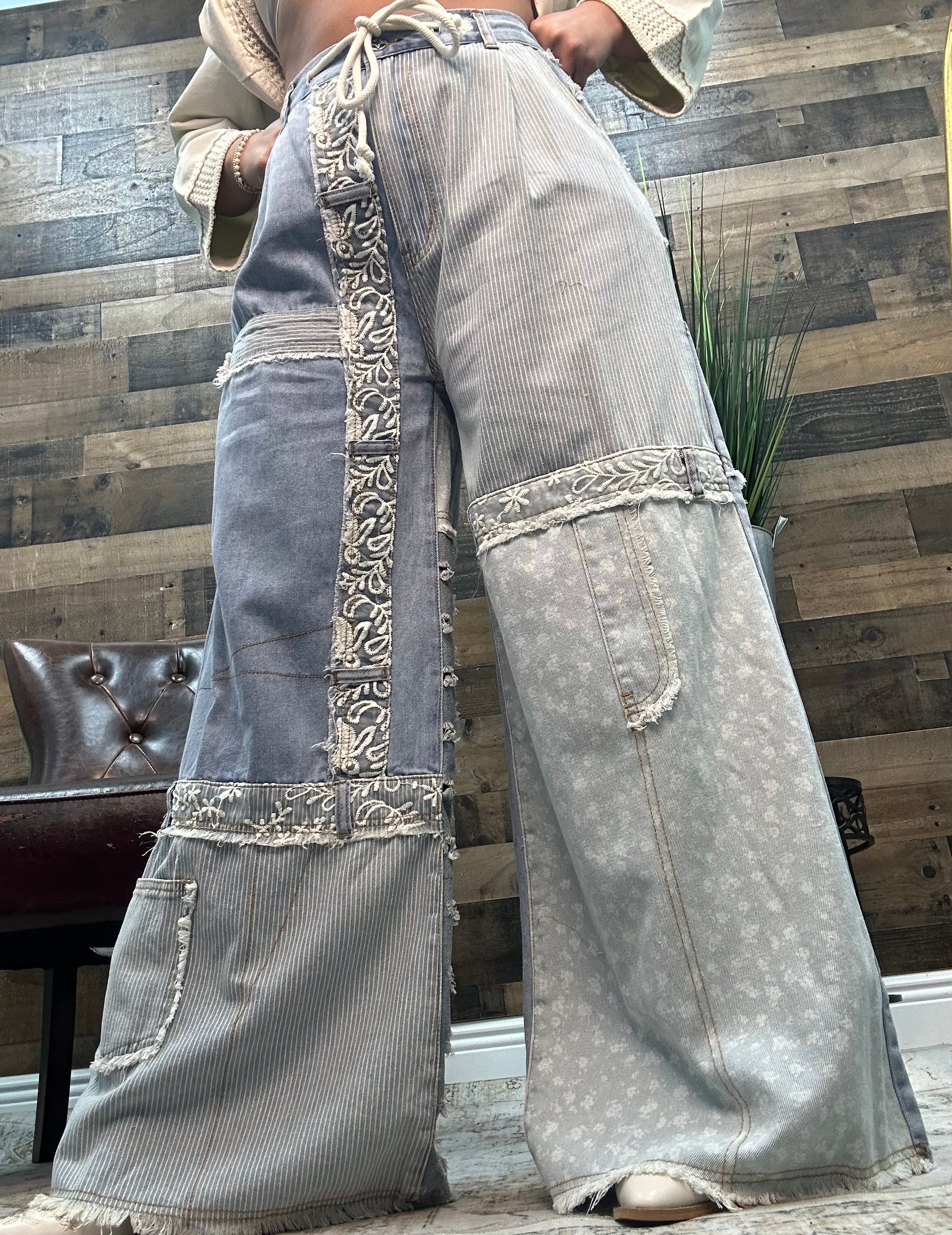 Step into effortless style with the POL Denim Patchwork Raw Edge Lace Accent Wide Leg Pants. These playful pants mix rugged denim patchwork with delicate lace accents, creating a fun contrast you’ll love. The raw edges add a carefree vibe, while the wide-leg cut keeps things breezy and comfortable. Perfect for making a bold statement with a twist of whimsy!