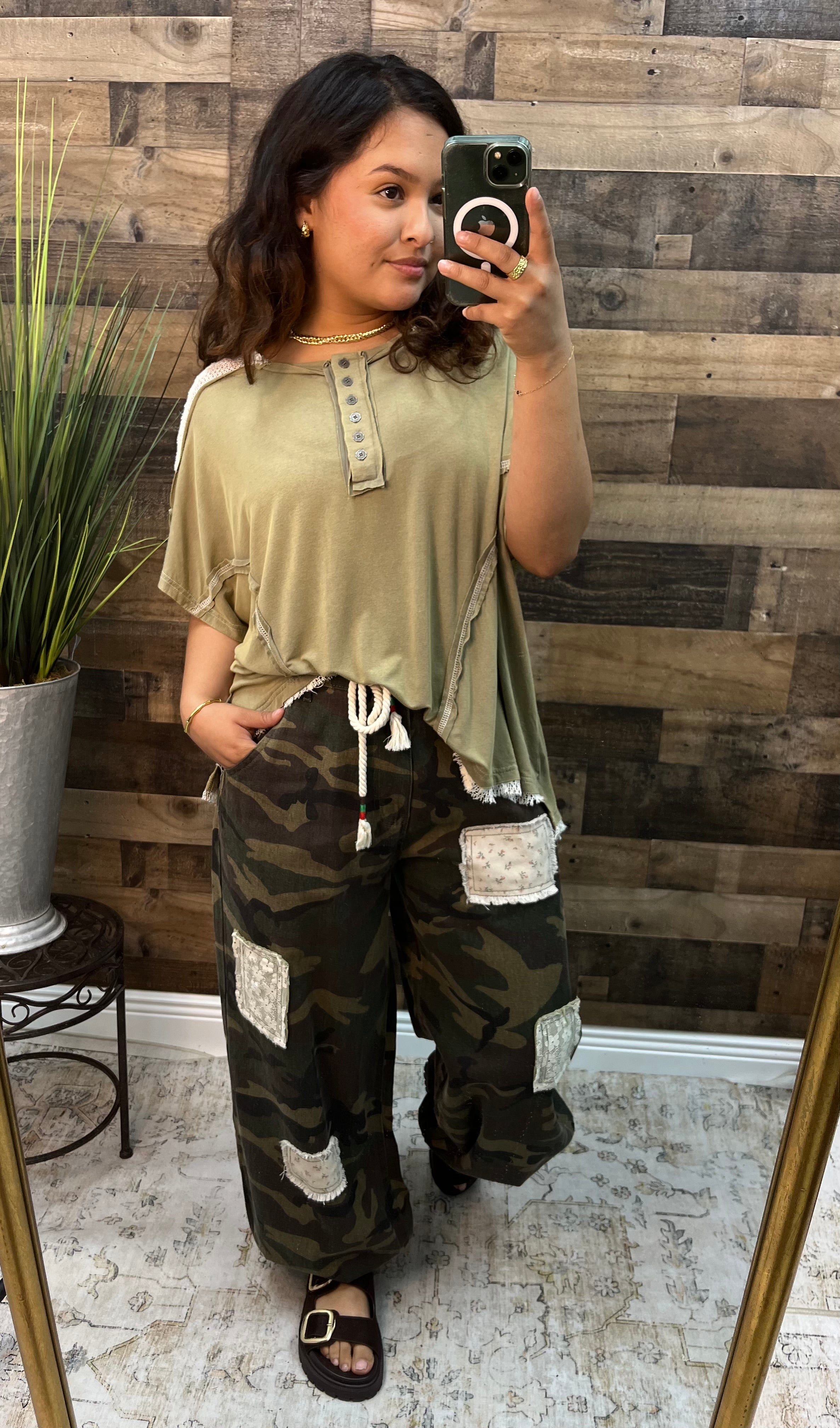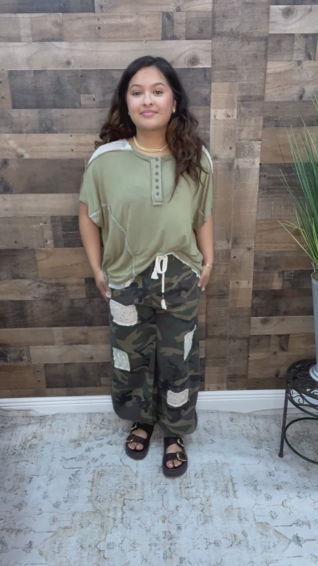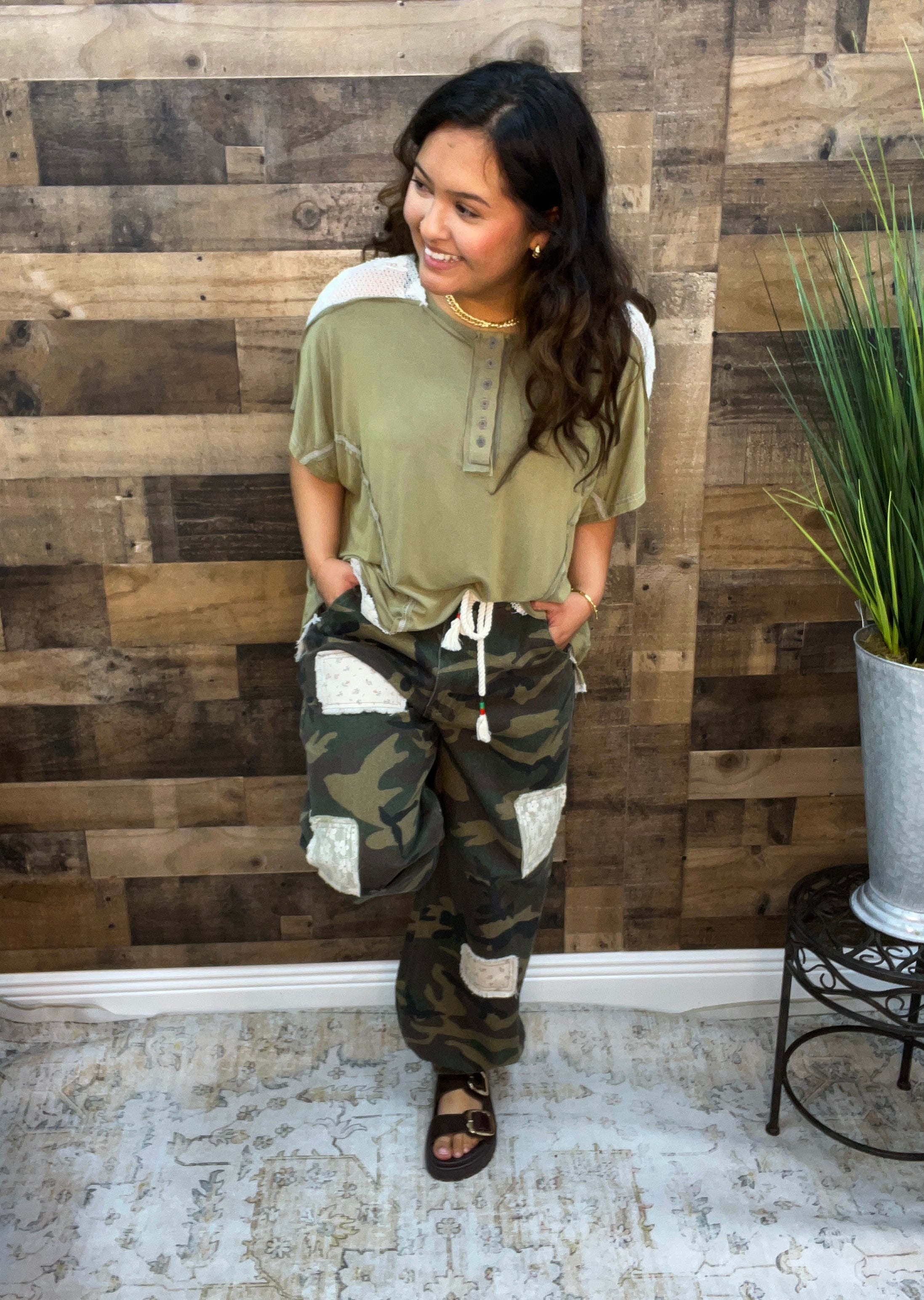 These POL Olive Camo Lace Patchwork Joggers bring playful charm to your casual wardrobe with a roomy fit and cozy printed twill fabric. Featuring unique lace and woven patches alongside an eye-catching camo print, they are finished with a fun drawstring accent for an adjustable, comfortable fit. Perfect for lounging or stepping out in style with a twist.