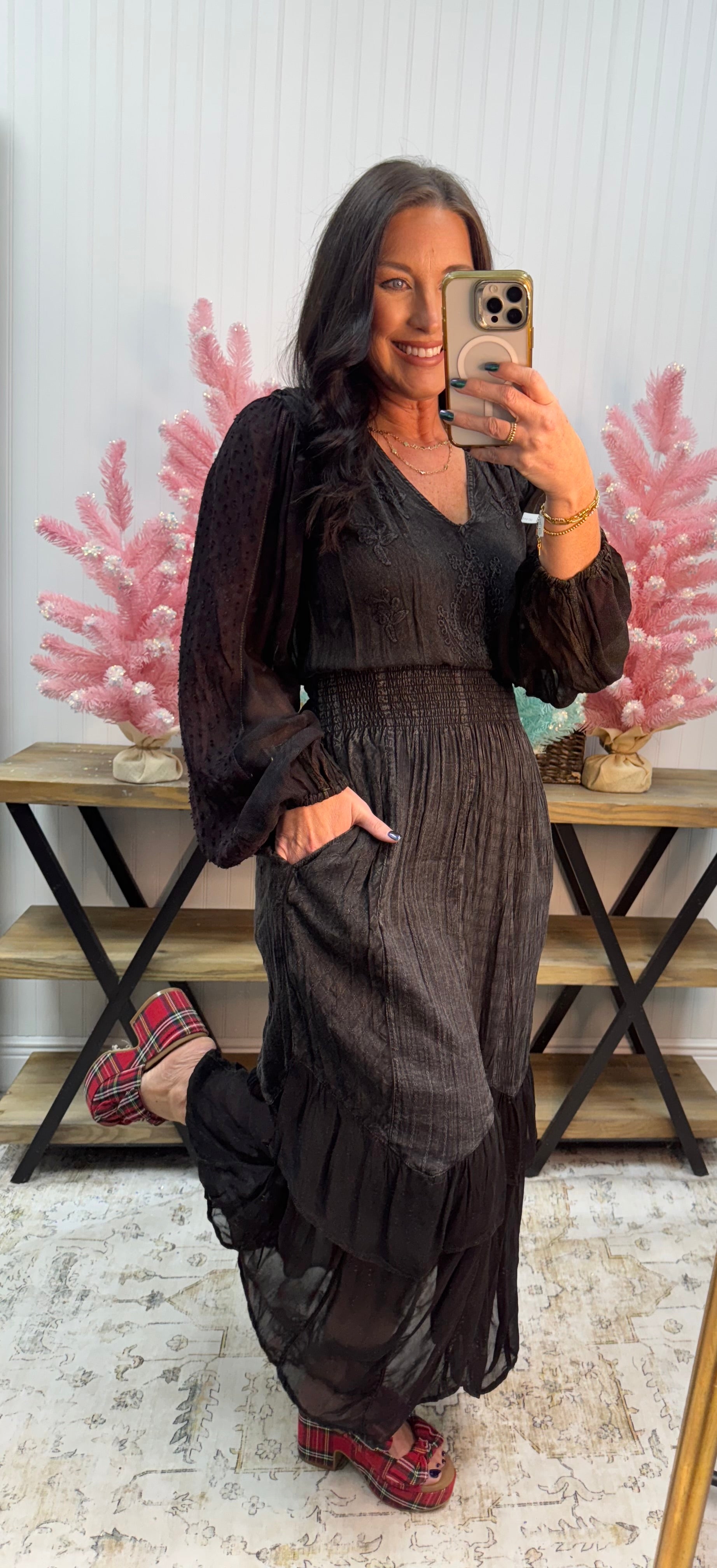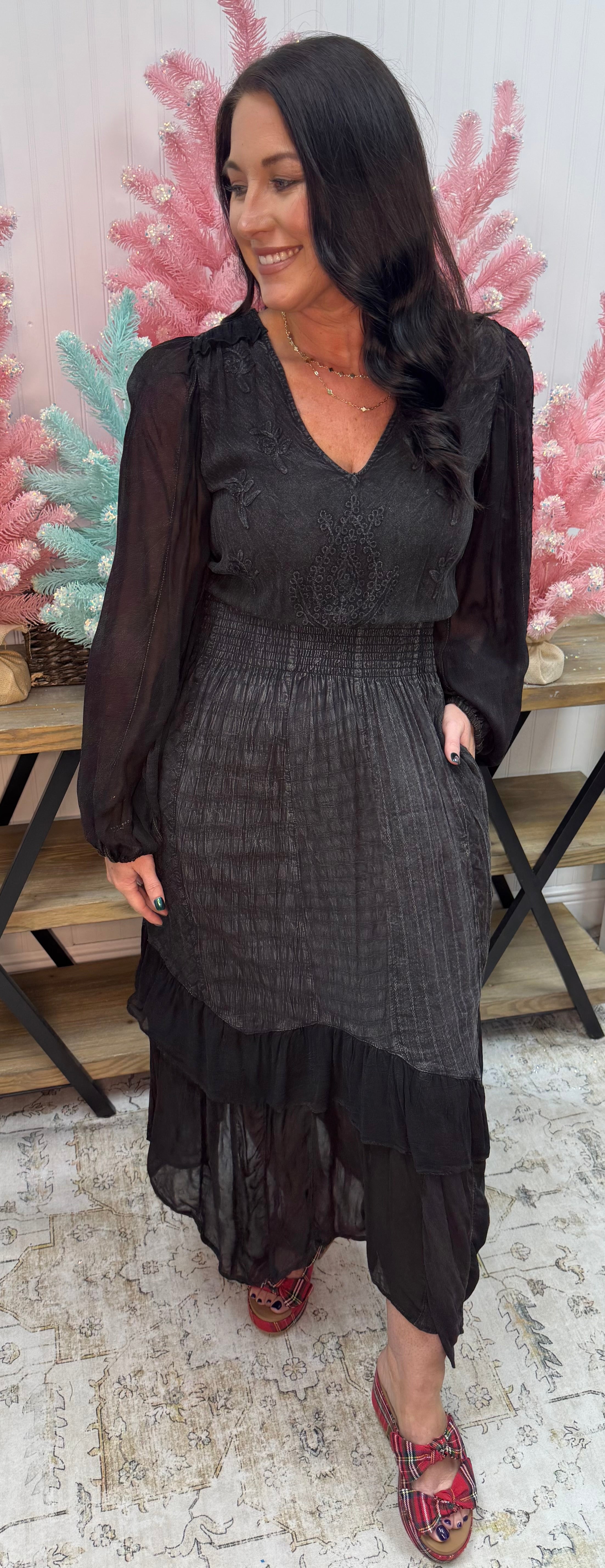 Embrace cozy boho vibes with this Young Threads Black Vintage Boho Embroidered Maxi Dress. Crafted from soft, flowy rayon, it flaunts intricate embroidery for a touch of artisanal charm. The long sleeves and smocked waist create a flattering silhouette, while playful ruffle details add feminine flair. It’s your go-to dress for fall and winter that keeps comfort and breathable style perfectly in sync.